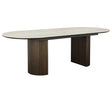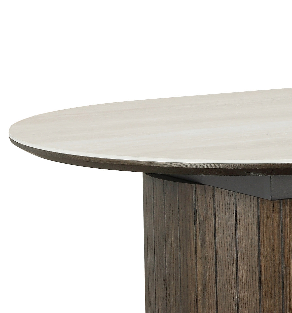 Bordet har en robust stomme i brunbetsad ek som ger en varm och elegant känsla, medan den keramiska travertin-toppen tillför en lyxig och slitstark yta.