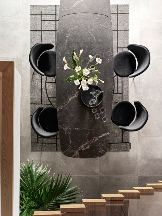 Tillverkad av lackad metall stödjer den centrala pelaren den eleganta toppskivan som med en raffinerad blandningen av metall och keramik med en marmoreffekt skapar en lekfull kontrast mellan kalla och varma material.