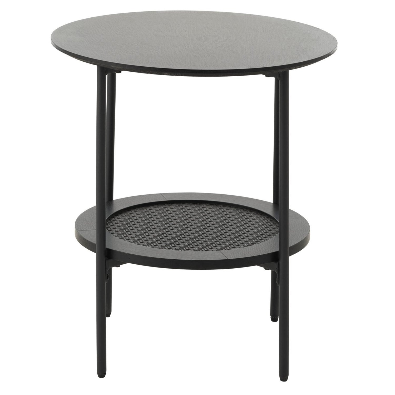 Detta minimalistiska sidobord erbjuder en elegant och funktionell design med en träbordsskiva och en nedre trähylla med en polyrottinginsats. Den slimmade metallramen säkerställer ett lätt visuellt avtryck, vilket gör det idealiskt att placera bredvid din soffa.