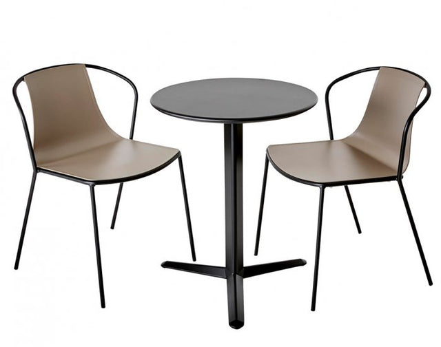 Bordet finns tillgängligt i två stilrena färger och flera olika storlekar för att passa olika utrymmen och behov. Den robusta basen är tillverkad av lackad aluminium, vilket ger stabilitet och långvarig hållbarhet, även under krävande förhållanden. Bordsskivan är tillverkad av lackat stål, vilket ger en elegant och tålig yta som är enkel att rengöra och underhålla.