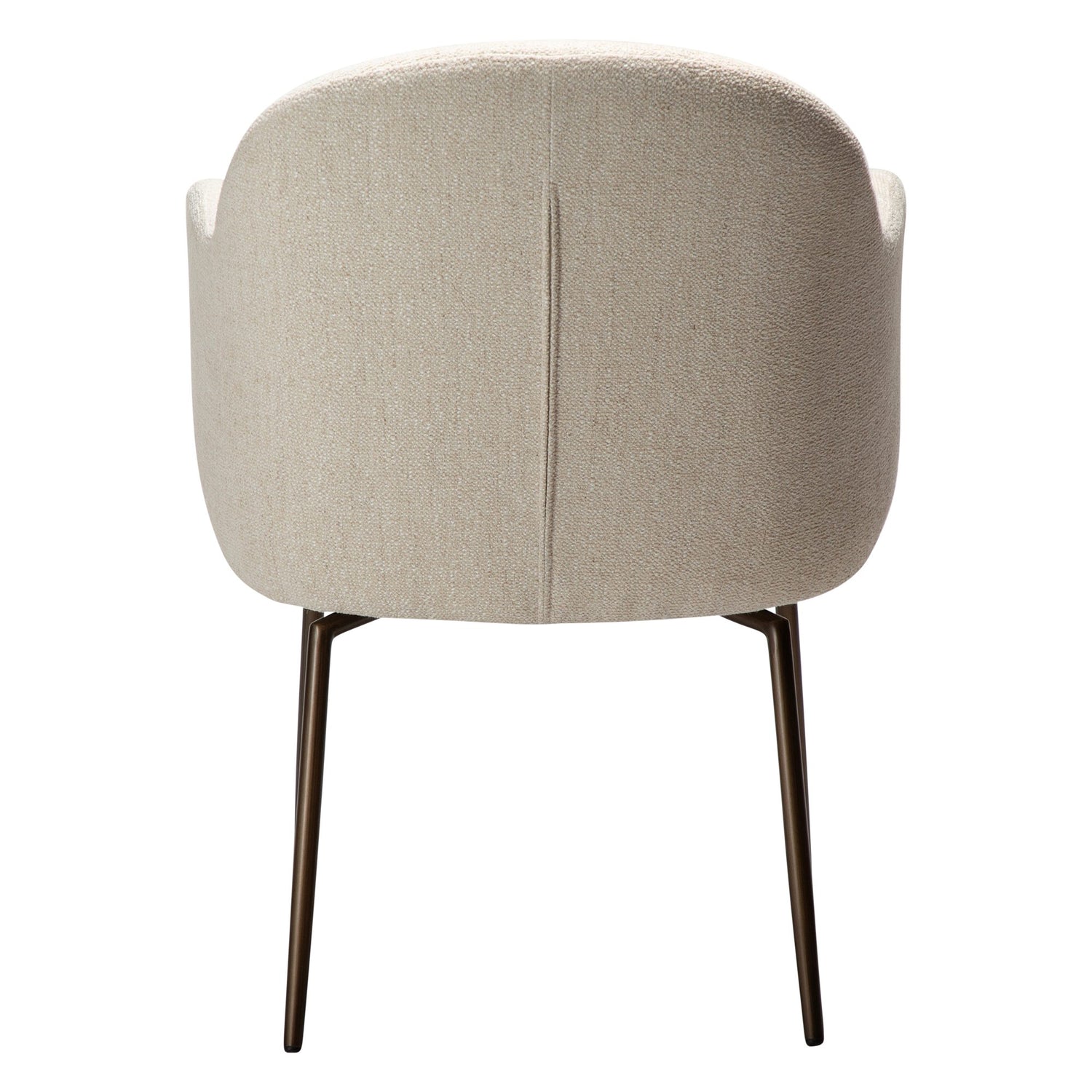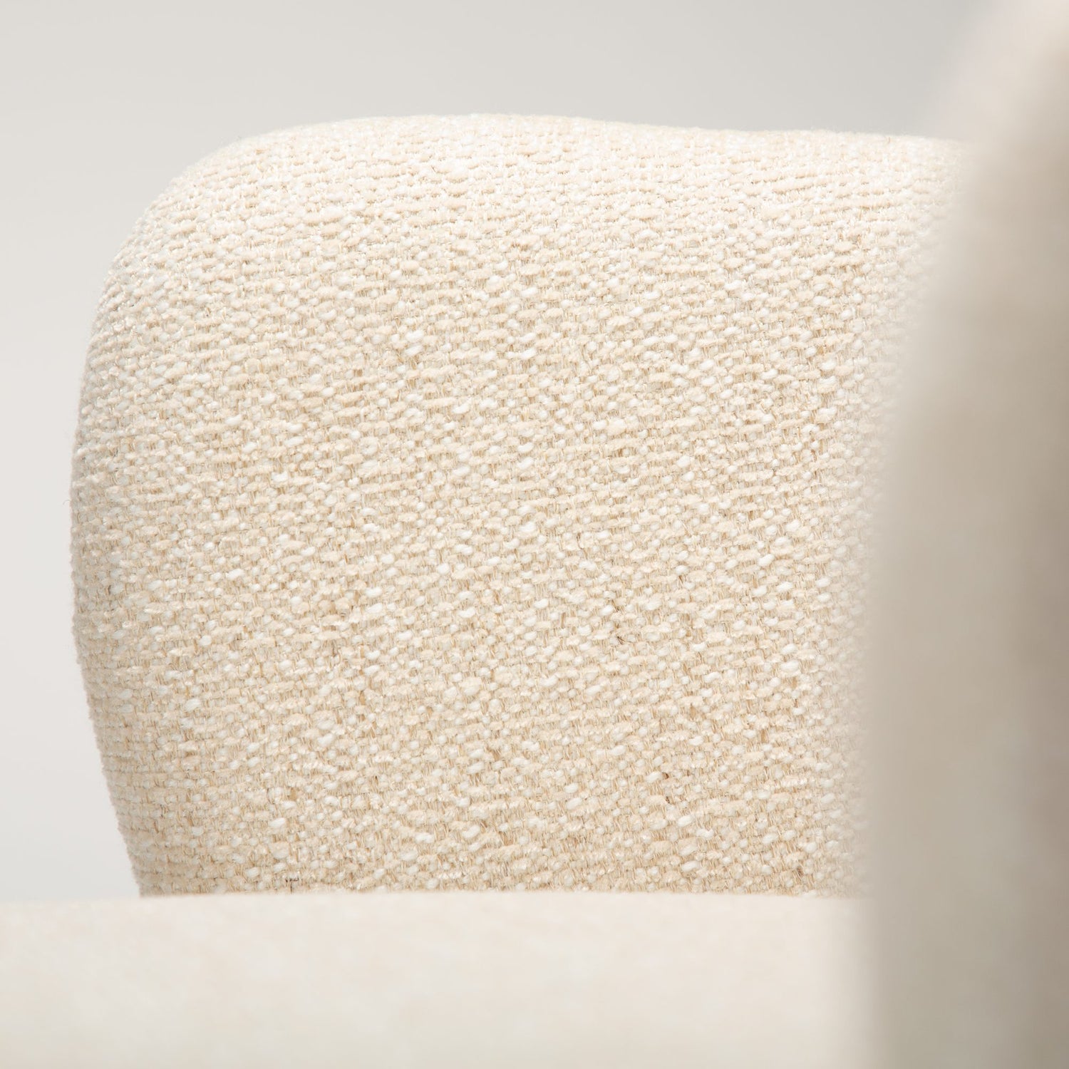 - Klädsel: i bouclé-tyg, ett bekvämt material känt för sin unika, öglade struktur och rika, taktila känsla. Ben: Metall med en handapplicerad antik finish. De svängbara benen erbjuder fördelen att kunna vridas från sida till sida. Autoåtergångsfunktionen säkerställer att stolen återgår till sin neutrala position.
