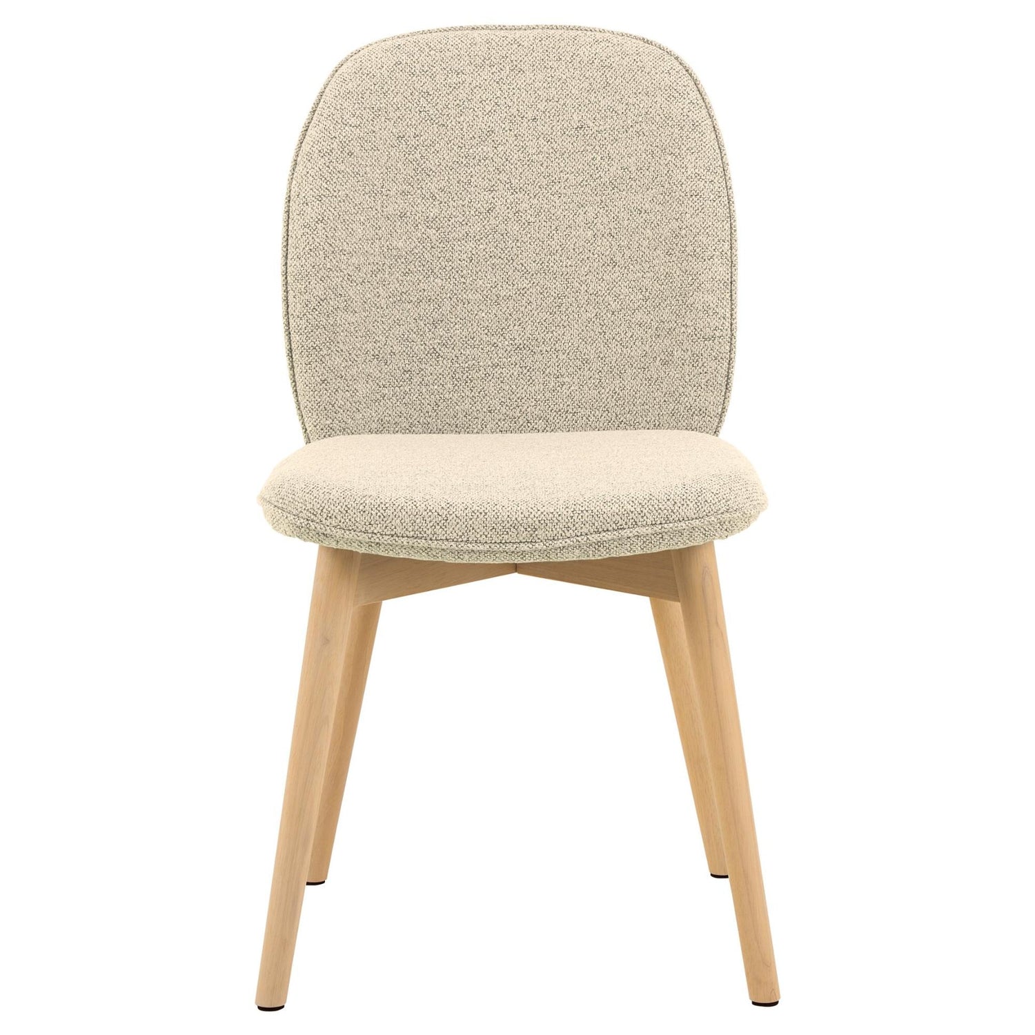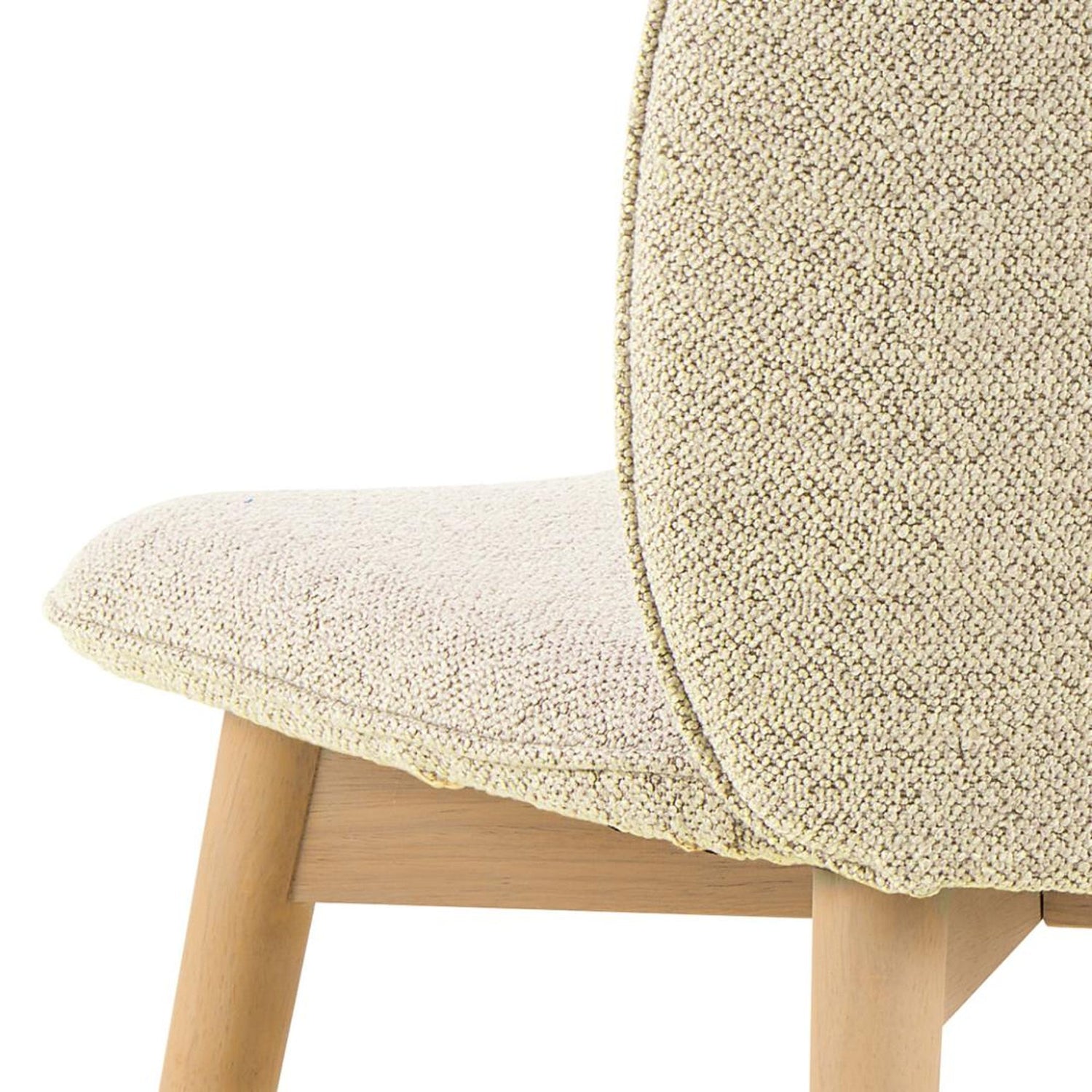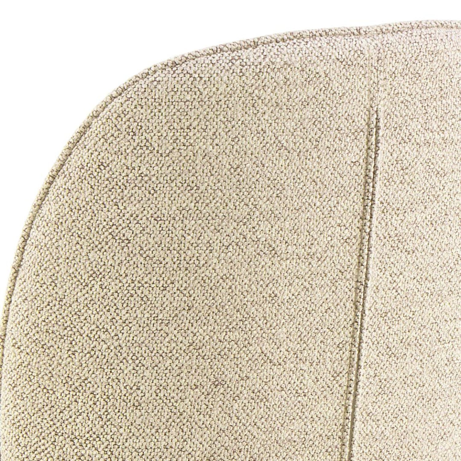 - Klädd i ett mjukt bouclé-liknande tyg i krämfärg