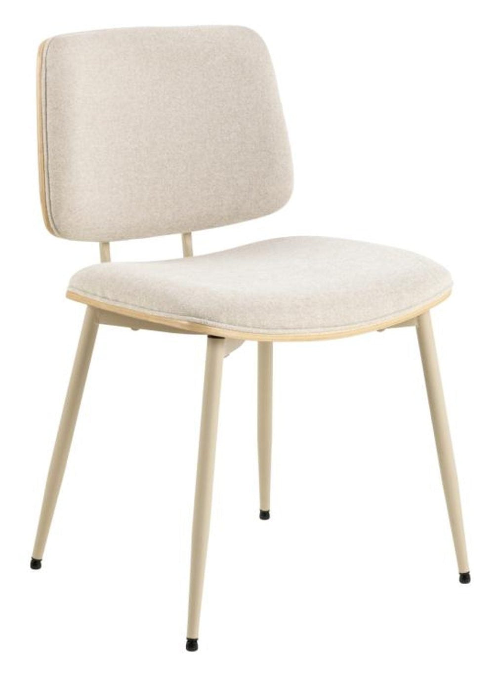 Denna matstol är definierad av en mjuk estetik, med sitts och rygg i formpressad ekfanér. Det beigea tyget vävt med chenillegarn ger extra komfort tillsammans med grå ben i pulverlackat stål.
