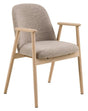 Denna matstol med armstöd ger en nordisk elegans till matsalen. Sitsen är klädd i ett beige bouclé-tyg med en lyxig lockig struktur för den där moderna, men ändå eleganta känslan. Stöttad av de smala benen har stolen ett skulpturalt utseende och eken understryker estetiken.