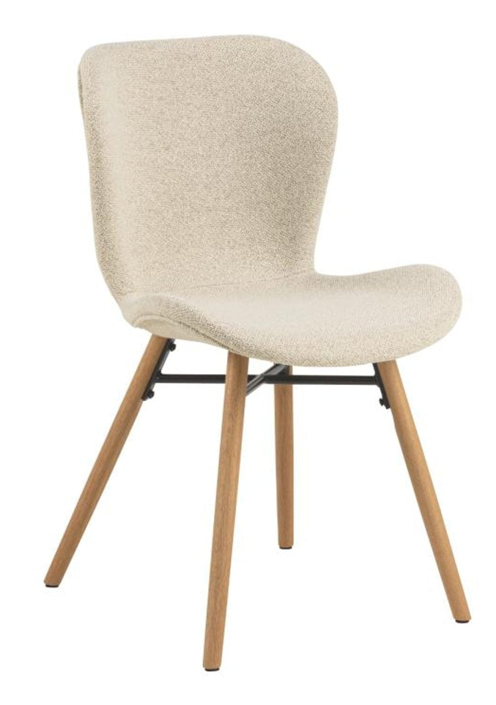 Den här matstolen balanserar stil och komfort och ger varje matplats en modern känsla. Sätet är klätt i ett mjukt krämfärgat boucléstyg som ger en stödjande och bekväm sittupplevelse. Tillsammans med en kraftig oljad ekbas ger stolen rummet en känsla av mysighet.