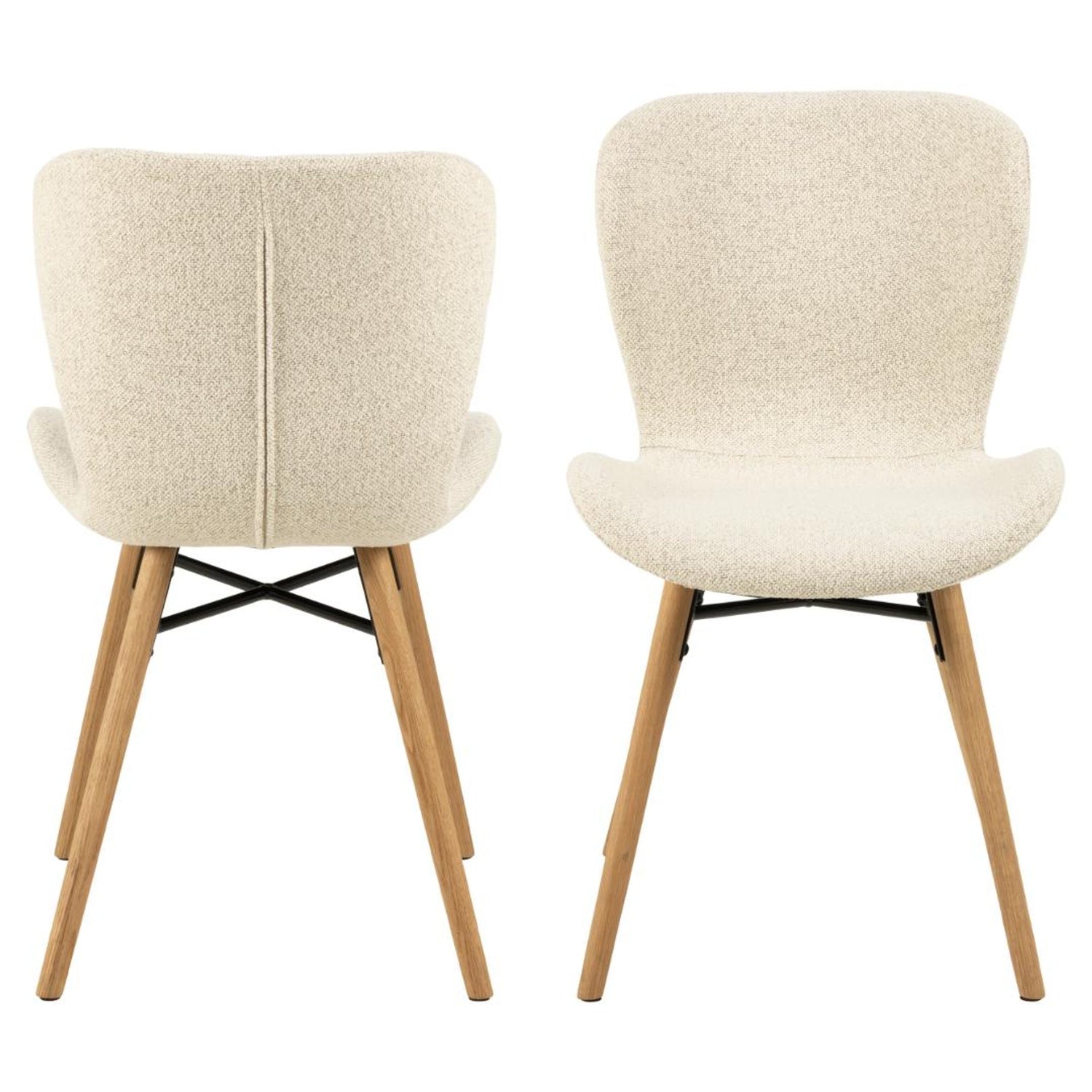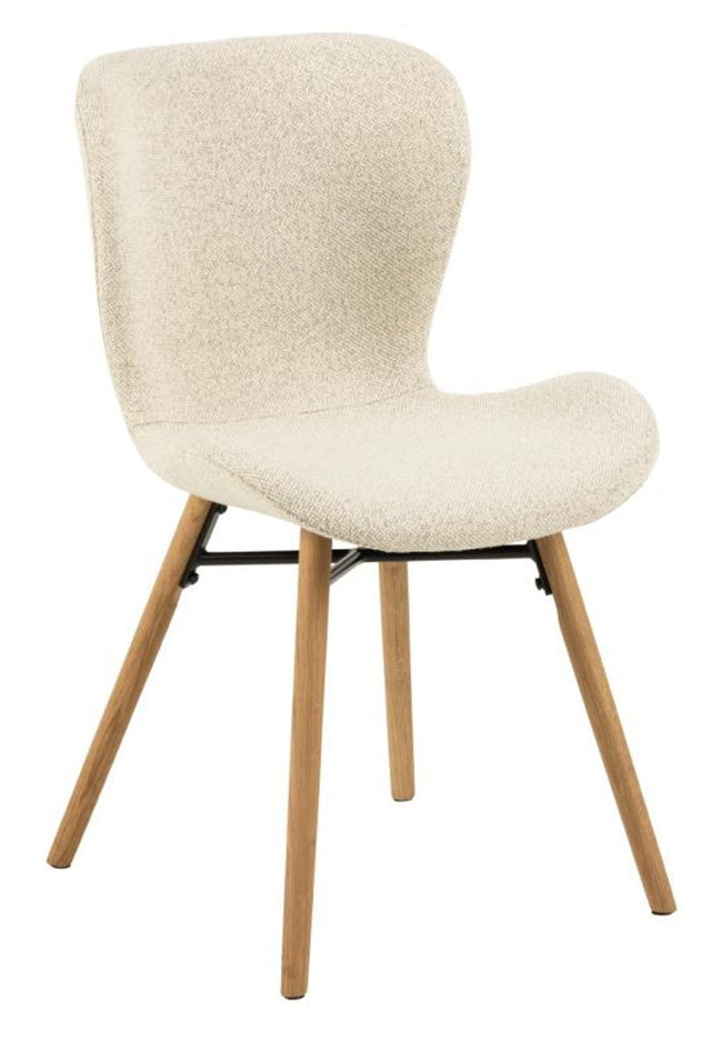 Att sitta i denna matstol känns nästan för bra för att vara sant. För att ge en bekväm upplevelse har stolen en organiskt formad sits med en omfamnande ryggstöd. Den är klädd i ett mjukt bouclétyg i krämfärg som smickrar de oljade ekbenen med svarta metallförbindelser och tillsammans ger stolen ett elegant utseende.