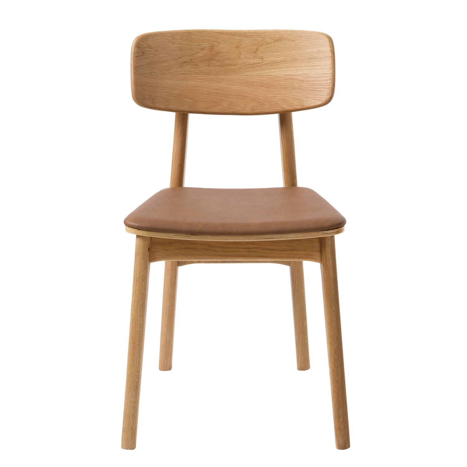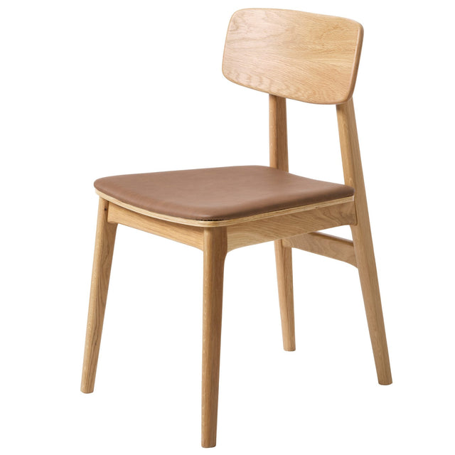 Shirley är en tidlös matstol i skandinavisk stil med ram i naturlig ek och en mjukt stoppad sits klädd i brunt, lättskött PU-läder. Det svagt böjda ryggstödet följer ryggen och ger skön support vid långa middagar, medan den rena silhuetten gör stolen enkel att matcha med olika bord och inredningsstilar.