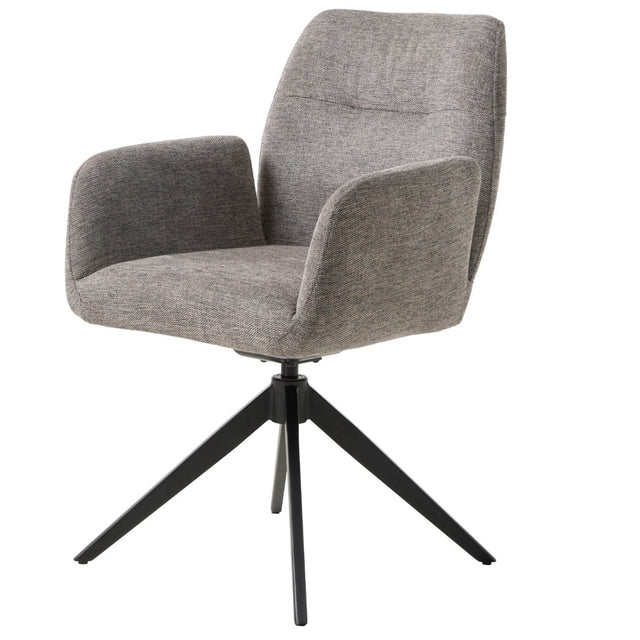 Sole är en mjukt stoppad snurrstol med armstöd som ger hög komfort vid både frukost och långmiddagar. Den omslutande sitsen i ljusgrå, tålig textil ger ett lugnt, modernt uttryck, medan den svarta metallbasen står stabilt och är lätt att matcha. Snurrfunktionen gör det enkelt att komma i och ur stolen – perfekt vid köksön eller matsalsbordet.