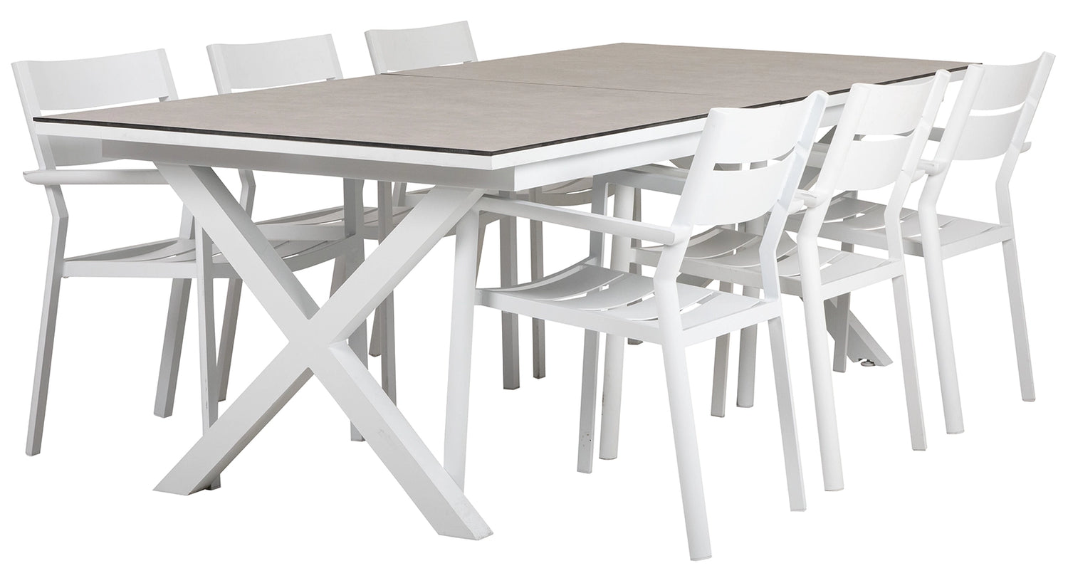 Stommen på Hillmond bordet finns i två färger där du kan välja mellan matchande färg i aluminium som topp eller högtryckslaminat som finns i två färger. Undertill sitter ett stilrent kryssunderrede som är infällt vilket gör att du kan sitta hela vägen. Hillmond är tillverkad helt i aluminium och är därför helt underhållsfri och klarar av väder och vind helt utmärkt.