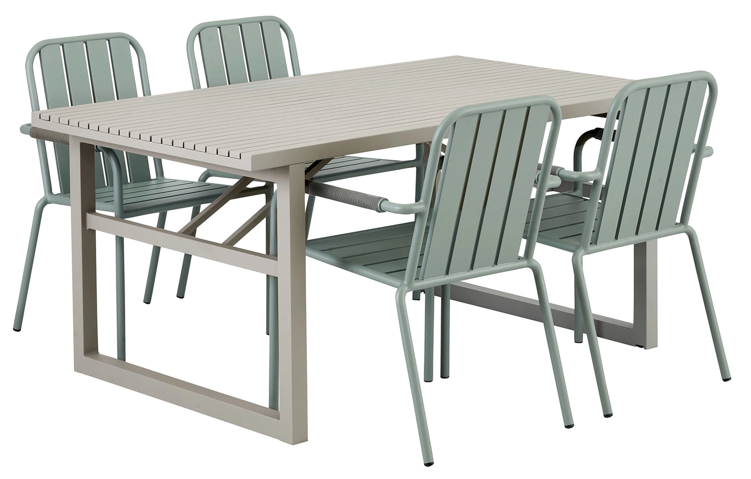 I matgruppen ingår ett Vevi matbord 160x90 cm och 4st Innes Karmstolar i Dusty Green.