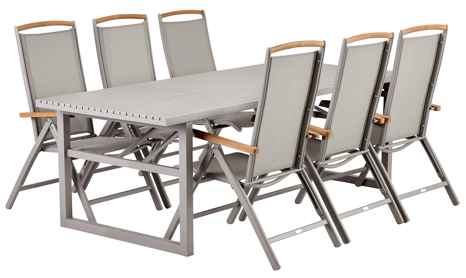 I matgruppen ingår ett Vevi matbord 230x95 cm och 6st Andy Positionsstolar med armstöd i teak.
