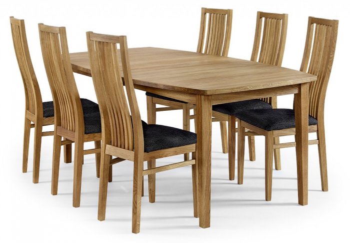 Allegro matgrupp är en snygg och elegant matgrupp med en stomme i massiv oljad ek och bordet har en massiv ek-kärna med en fanérad ektopp. Bordet är ovalt med bågformade kanter och har plats för två iläggsskivor som även ingår i priset. Stolen kommer med en helmonterad stomme, vilket ger en bra stabilitet och kvalitet. Stolssiten går att välja mellan svart läder eller grått tyg. I denna matgrupp i Allegro serien ingår det ett 186 cm bord och sex stycken stolar, samtliga med en stomme i oljad ek och tygsits.