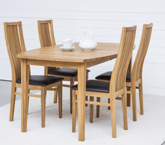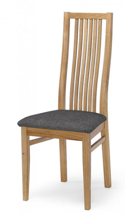 Allegro är en elegant och bekväm stol i massiv oljad ek med en sits i grått tyg. Den finns även med svart läder och vitlackad stomme. Tillverkad av Torkelson.