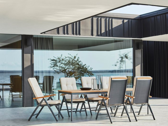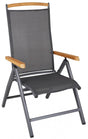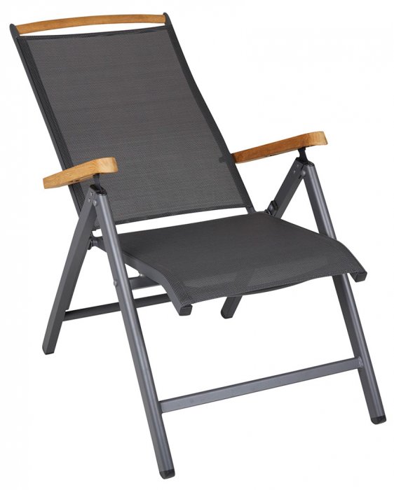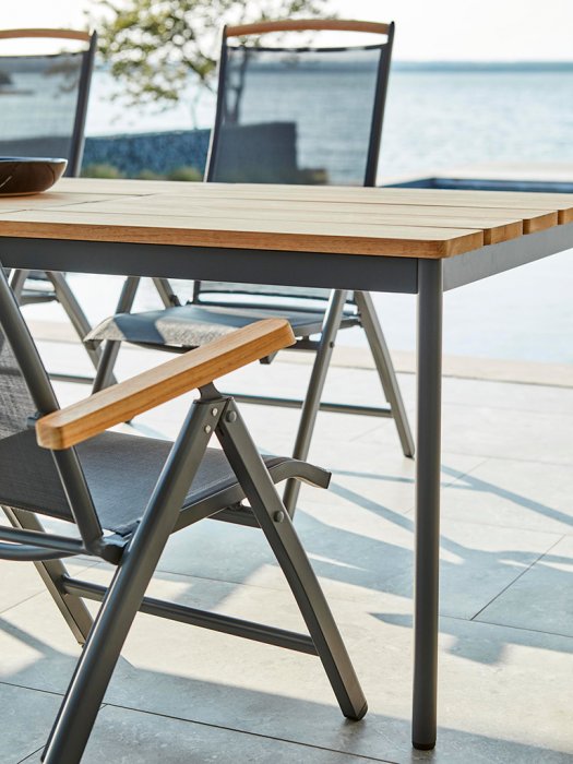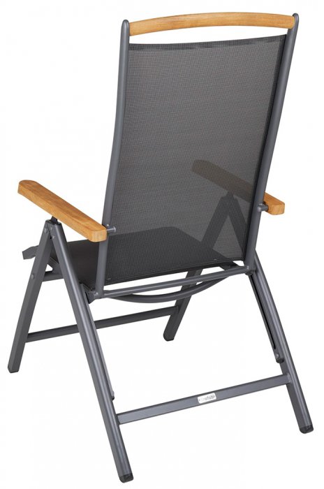 Ryggstödet är konstruerat av textilene, medan armstöd och överliggare är tillverkade av massiv teak, vilket inte bara ger hållbarhet utan också en naturlig och varm känsla. Andy Positionsstol är justerbar i ryggen och kan enkelt fällas ihop för smidig förvaring när den inte används.