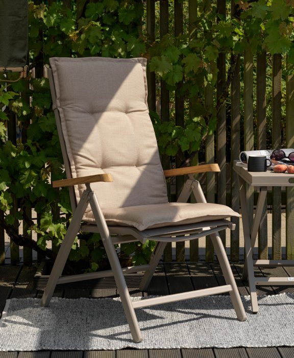 Andy positionsstol håller ställningarna som en av våra absolut mest populära stolar. Stomme av aluminium och rygg av textilene, Armstöd och överliggare i massiv teak. Den är ställbar i ryggen och går att fälla ihop. Andy positionsstol finns i en mängd färgkombinationer och går att kombinera med bord i olika storlekar och material. Andy finns även med grå nonwood på detaljerna. Köp till dyna för extra bra komfort.