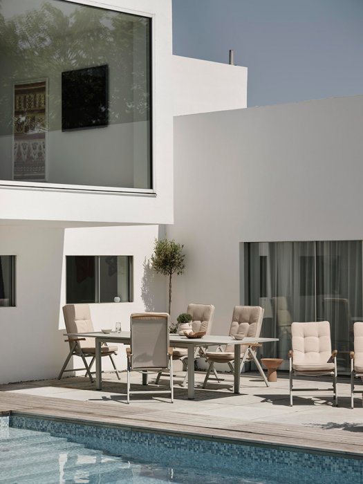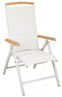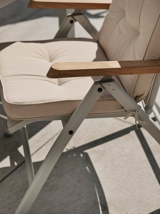 Ryggstödet är konstruerat av textilene, medan armstöd och överliggare är tillverkade av massiv teak, vilket inte bara ger hållbarhet utan också en naturlig och varm känsla. Andy Positionsstol är justerbar i ryggen och kan enkelt fällas ihop för smidig förvaring när den inte används.