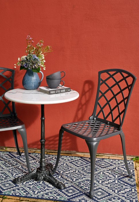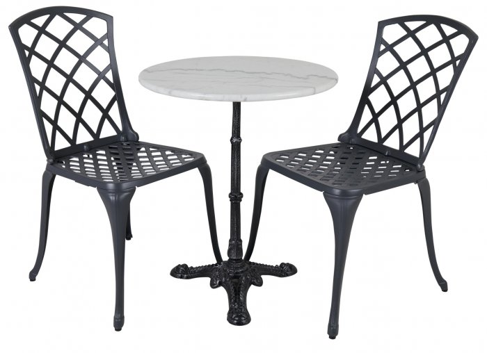 Cafégrupp med Arras gjutna caféstolar i aluminium och Loire cafébord med ett underrede i gjutjärn och bordsskiva av marmor. En tidlös cafégrupp som passar lika bra på den lilla balkongen som ute på torpet. Marmorskivan är ett naturmaterial vilket innebär att ingen bordsskiva är den andra lik.