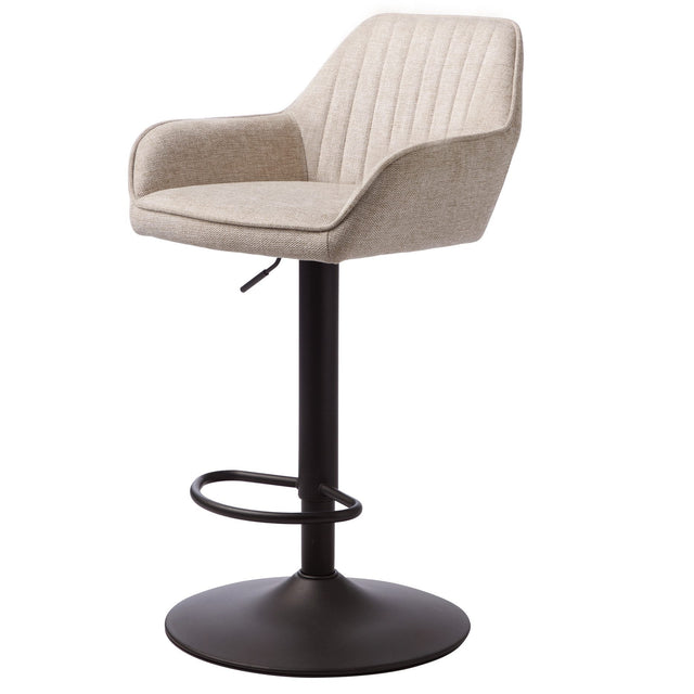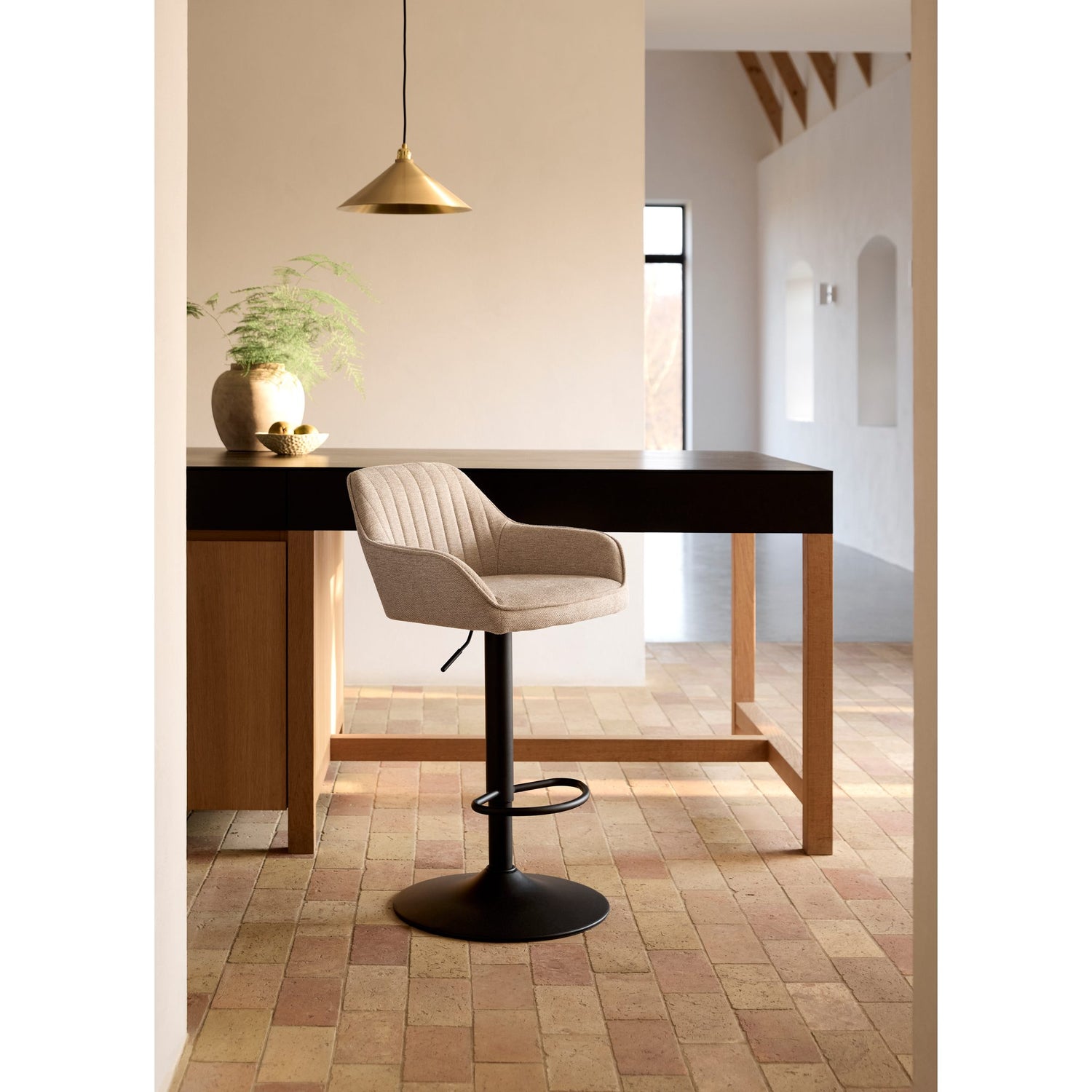Cubo Randig i sand ger köksön en ljus och varm ton. Den mjukt formade sitsen med låg armstödskant är klädd i sandfärgat tyg med elegant vertikal randsömnad. Den svarta trumpetfoten i pulverlackerad metall ger stabilitet och ett rent uttryck, medan den integrerade fotstödsringen avlastar benen. Med gaslift justerar du enkelt höjden för perfekt passform vid både köksö och barbord. Finns även i mörkgrå.