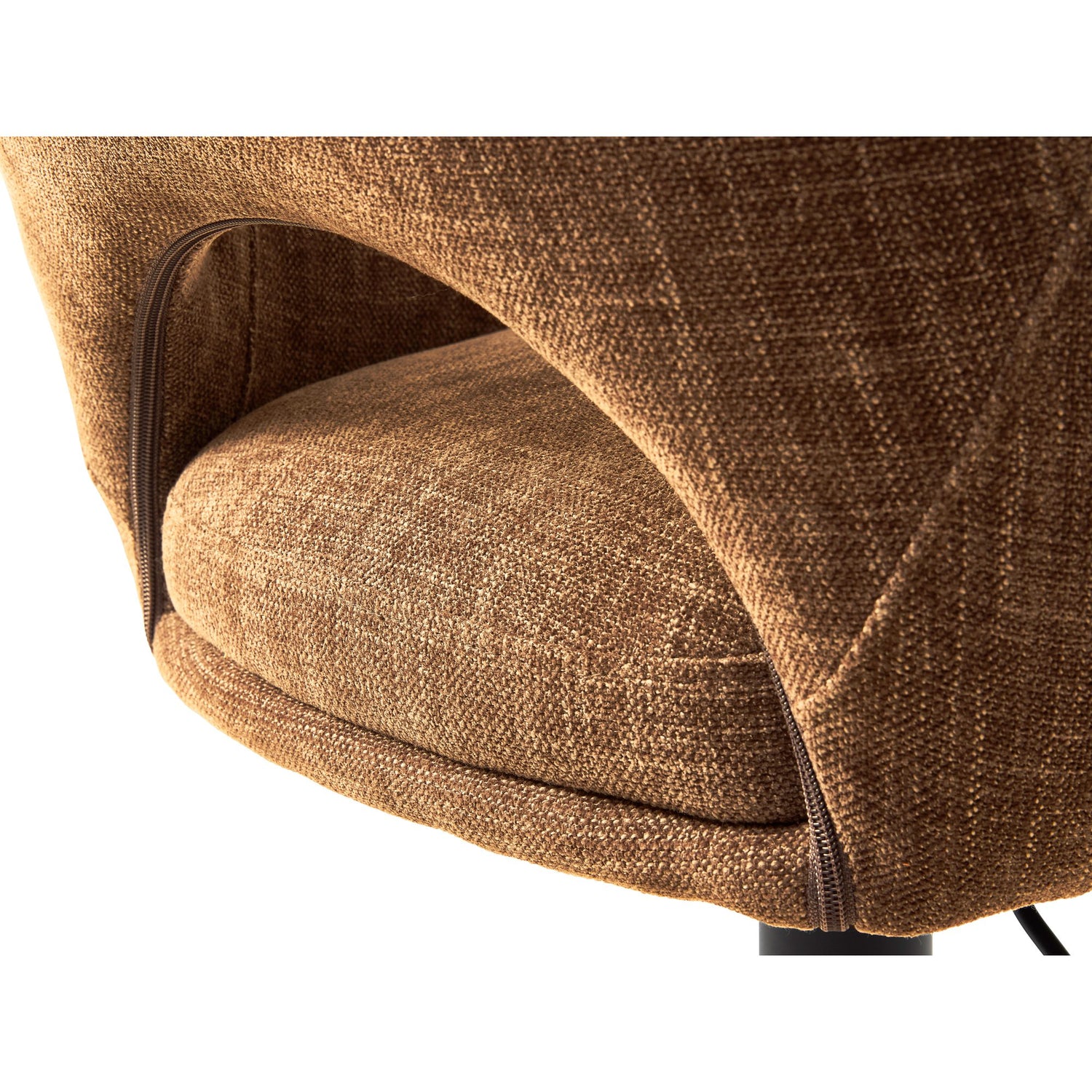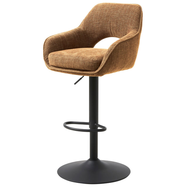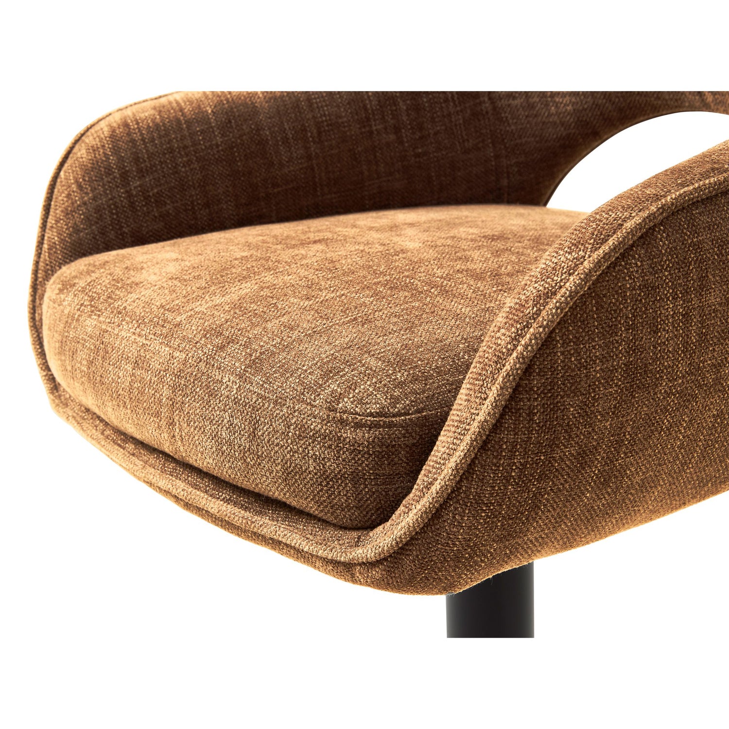 Ratio barstol i roströd ton gör matplatsen eller köksön lite mer personlig utan att kännas skrikig. Den rundade sitsen med integrerade armstöd och mjuk stoppning bjuder in till att sitta kvar länge, medan den svarta trumpetbasen i metall ger stabilitet och en tydlig, modern kontrast. Det varmare tyget adderar en ombonad känsla och funkar fint ihop med både ek, svart och mörka stenar. Stolen är höj- och sänkbar och har fotstöd, så du kan anpassa komforten efter bordshöjden. Finns även i beige och granitgrå och skogsgrön.