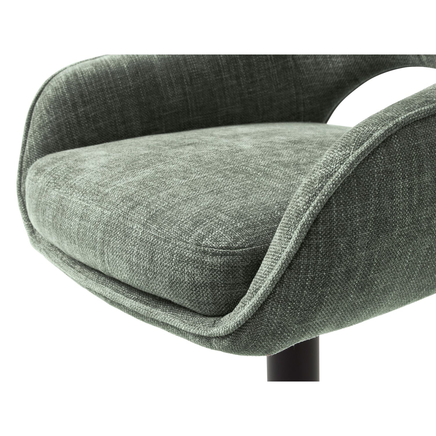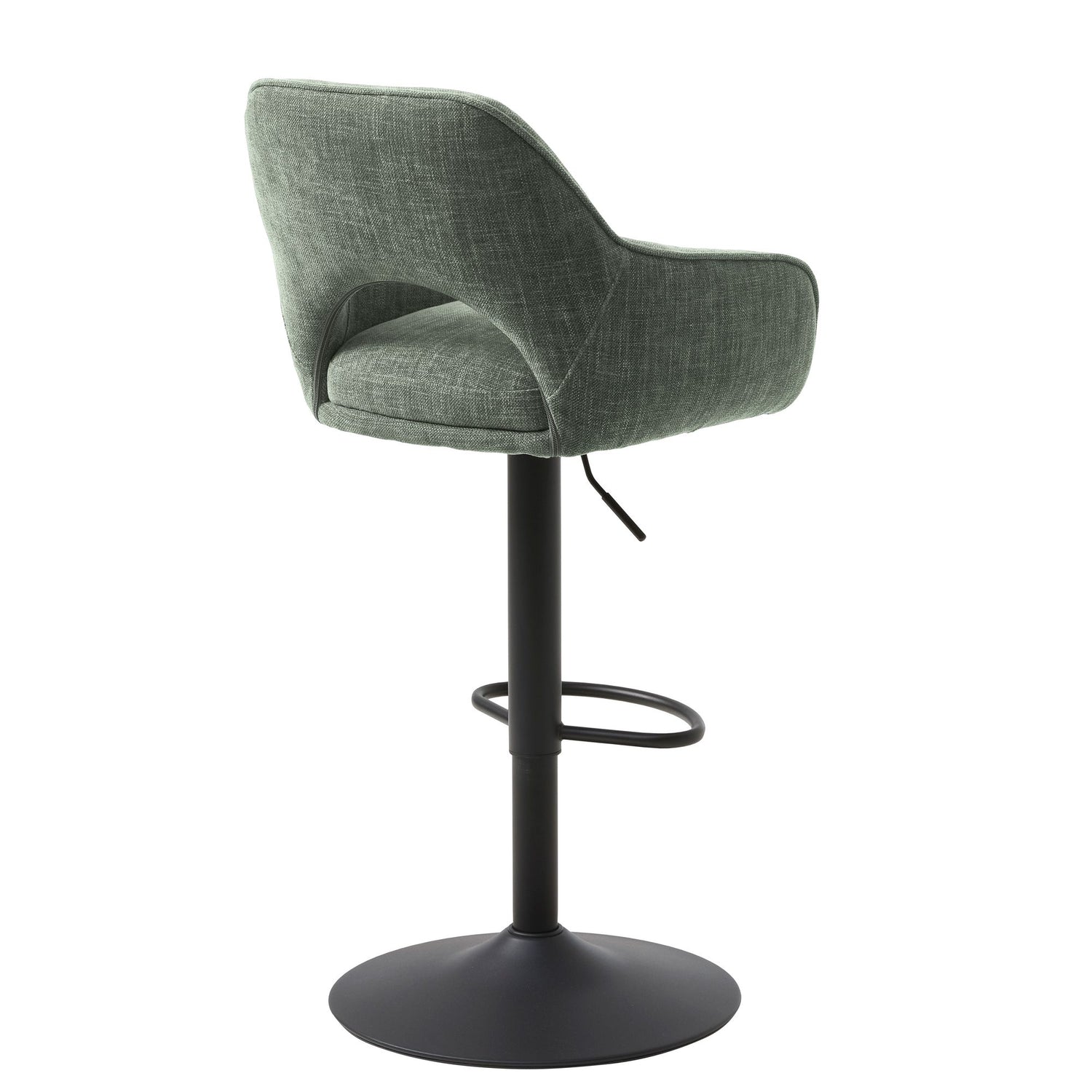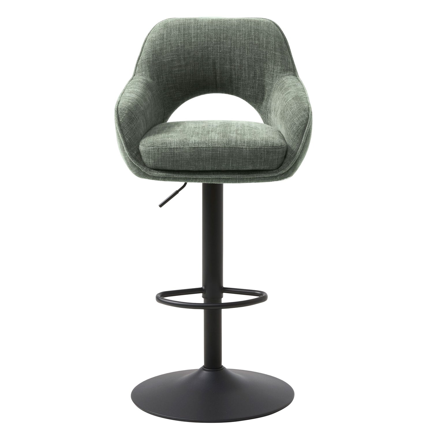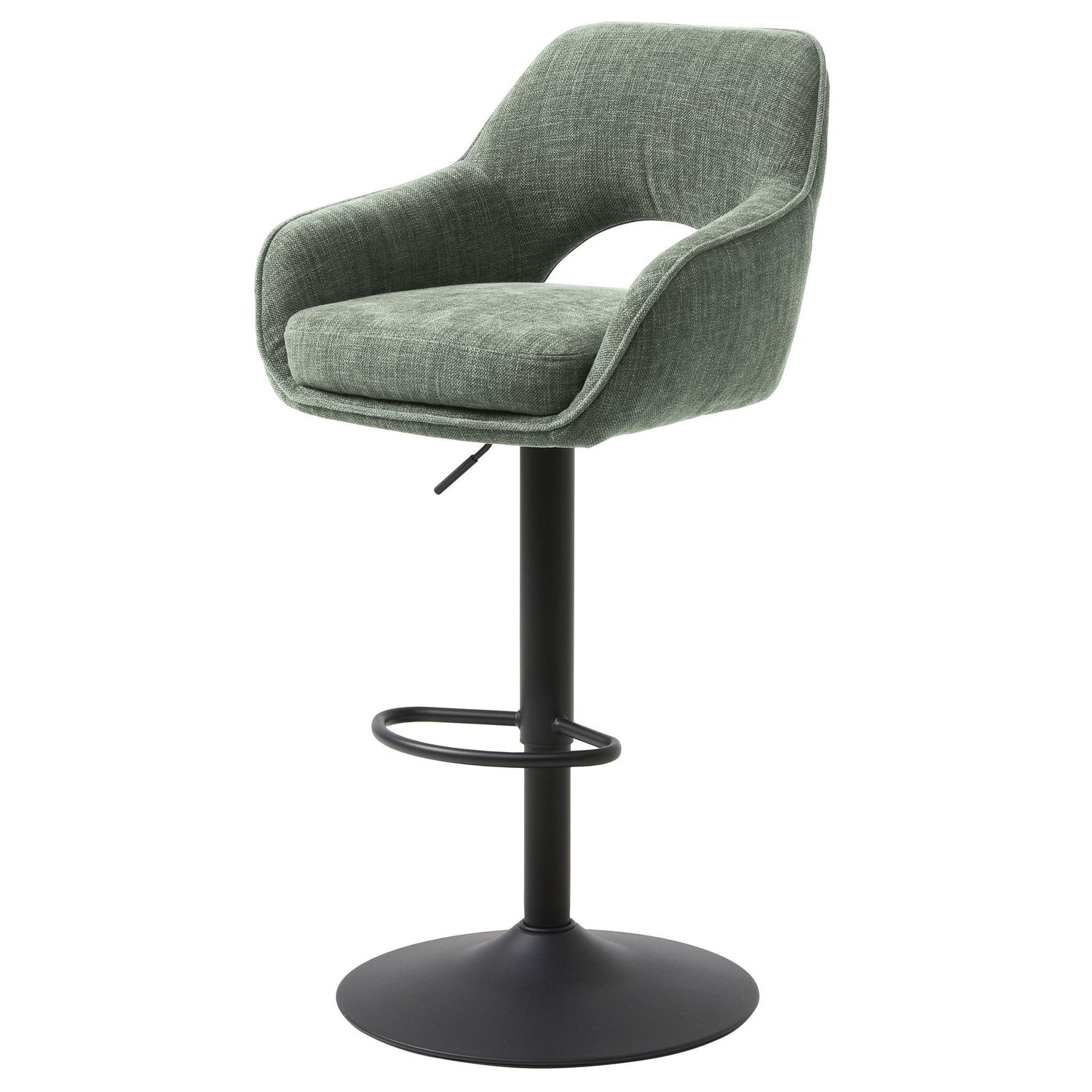Ratio barstol i skogsgrönt tyg ger din matplats en lugn och naturlig känsla. Den rundade sitsen med mjuk stoppning och integrerade armstöd erbjuder skön komfort, medan den svarta trumpetbasen i metall ger ett modernt och stabilt intryck. Färgen för tankarna till nordisk natur och är enkel att kombinera med både trä, sten och neutrala toner. Tack vare höj- och sänkbar funktion passar Ratio perfekt vid köksöar och barbord i olika höjder. Finns även i beige, granitgrå och rost.