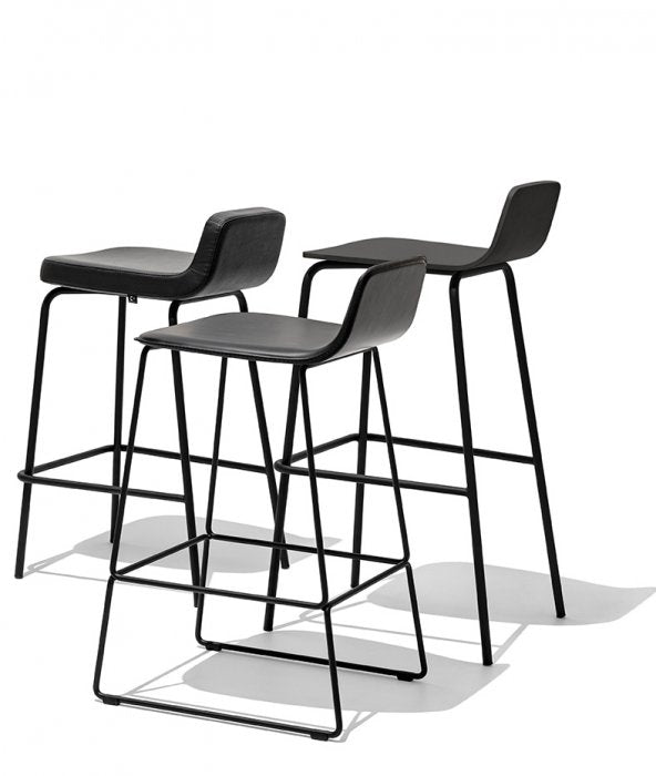 Riley barstol har en sofistikerad design med en sits med rundad kant och ett något upphöjt ryggstöd. Den kantiga metallramen kommer i ett urval av klassiska rörformade raka ben eller något smalare slädbensstil i mattlackerade färger. Sitsen kan väljas i ett urval av tyg och konstläder.