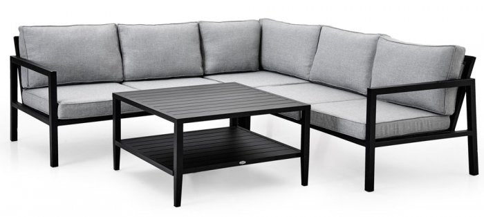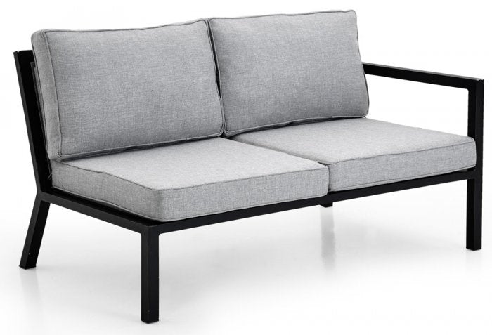 Belfort är en modern och praktisk modulsoffa i svartlackad aluminium med grå polyesterdynor/klädsel från Brafab. Tyget på soffan är av mycket hög kvalitet och klarar av småskurar men bör förvaras under tak eller i dynlåda när gruppen inte används. Stommen är helt underhållsfri och kan stå ute under hela sommarsäsongen. Belfort serien finns både med svart eller vit stomme. Nu har dynan ändrats på Belfort till ljusgrå.