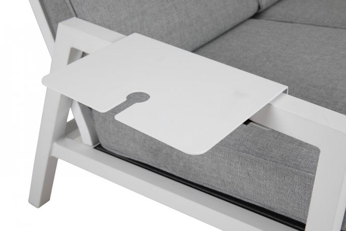 Belfort är en modern och bekväm loungeserie i lackad aluminium med grå dynor från Brafab. Tyget på fåtöljen är tillverkat av Olefin som har en mycket hög kvalitet och klarar av småskurar men bör förvaras under tak eller i dynlåda när fåtöljen inte används. Belfort har är en positionsfåtölj vilket gör att du kan ställa ryggen steglöst i vilken vinkel du vill tack vare den fiffiga gasfjädringen. Stommen är helt underhållsfri och kan stå ute under hela sommarsäsongen. Belfort serien finns både med svart eller vit stomme.