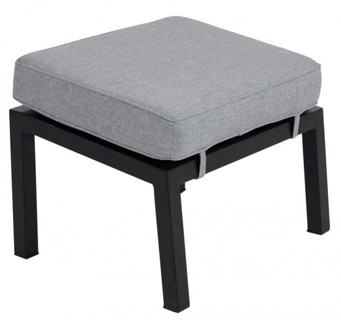 Belfort är en modern och praktisk liten fotpall i svartlackad aluminium med grå dynor från Brafab. Tyget på pallen är tillverkat av Olefin som har en mycket hög kvalitet och klarar av småskurar men bör förvaras under tak eller i dynlåda när fåtöljen inte används. Stommen är helt underhållsfri och kan stå ute under hela sommarsäsongen. Belfort serien finns både med svart eller vit stomme. Fotpallen passar perfekt till positionsstolen eller reclinersofforna i samma serie. Nu har dynan ändrats på Belfort till ljusgrå.