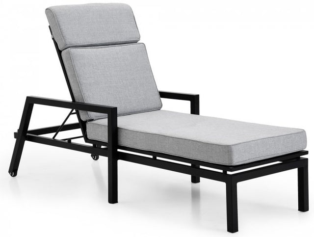 Belfort är en modern och bekväm vilsäng i svartlackad aluminium med grå dynor från Brafab. Tyget på vilsängen är tillverkat av Olefin som har en mycket hög kvalitet och klarar av småskurar men bör förvaras under tak eller i dynlåda när sängen inte används. Du kan ställa ryggen på Belfort i olika vinklare ner till helt platt liggande ställning. Stommen är helt underhållsfri och kan stå ute under hela sommarsäsongen. Belfort serien finns både med svart eller vit stomme.