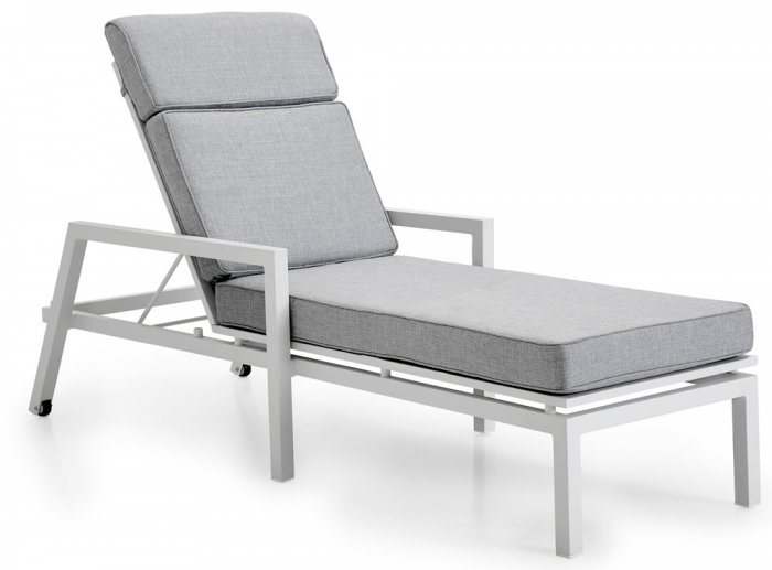 Belfort är en modern och bekväm vilsäng i vitlackad aluminium med grå dynor från Brafab. Tyget på vilsängen är tillverkat av Olefin som har en mycket hög kvalitet och klarar av småskurar men bör förvaras under tak eller i dynlåda när sängen inte används. Du kan ställa ryggen på Belfort i olika vinklare ner till helt platt liggande ställning. Stommen är helt underhållsfri och kan stå ute under hela sommarsäsongen. Belfort serien finns både med svart eller vit stomme.
