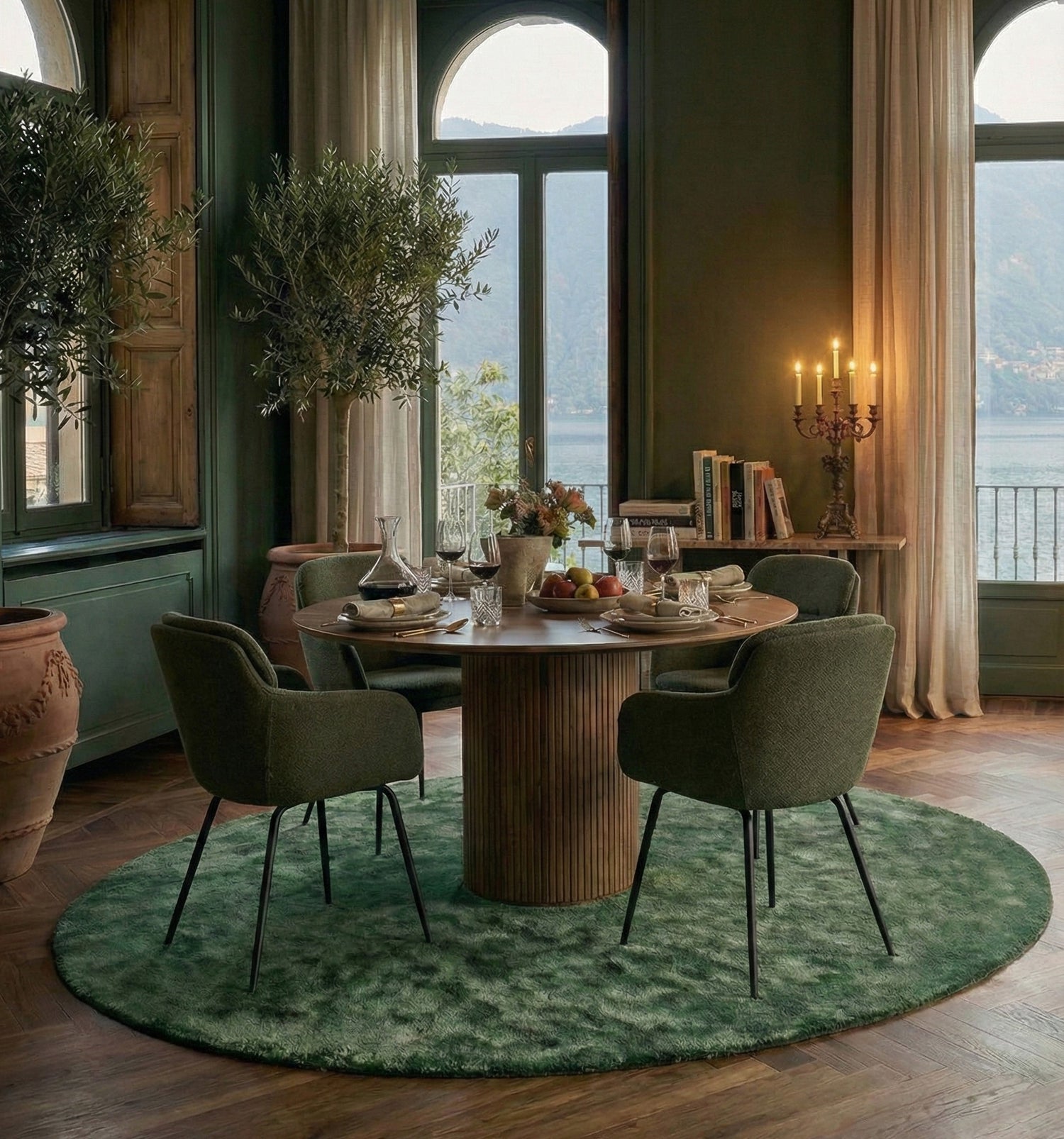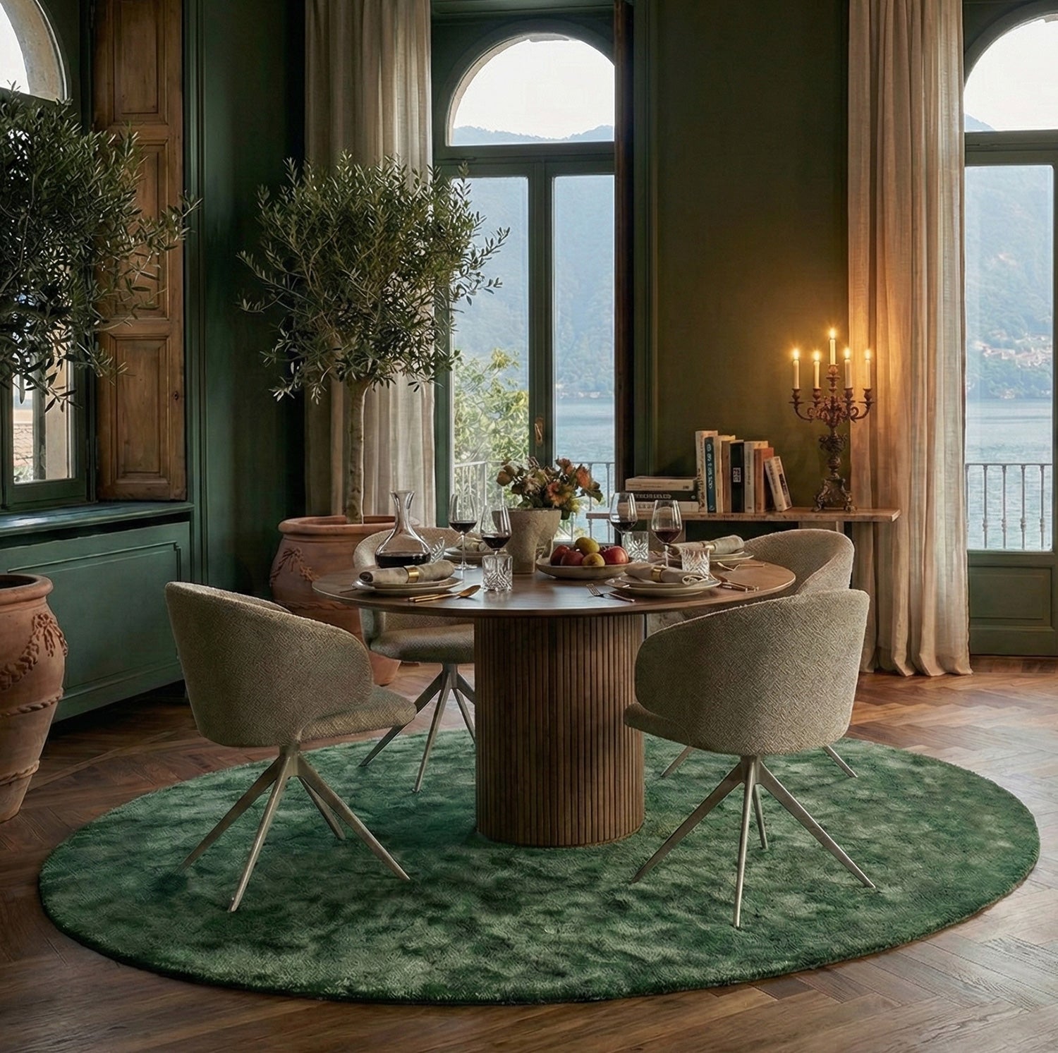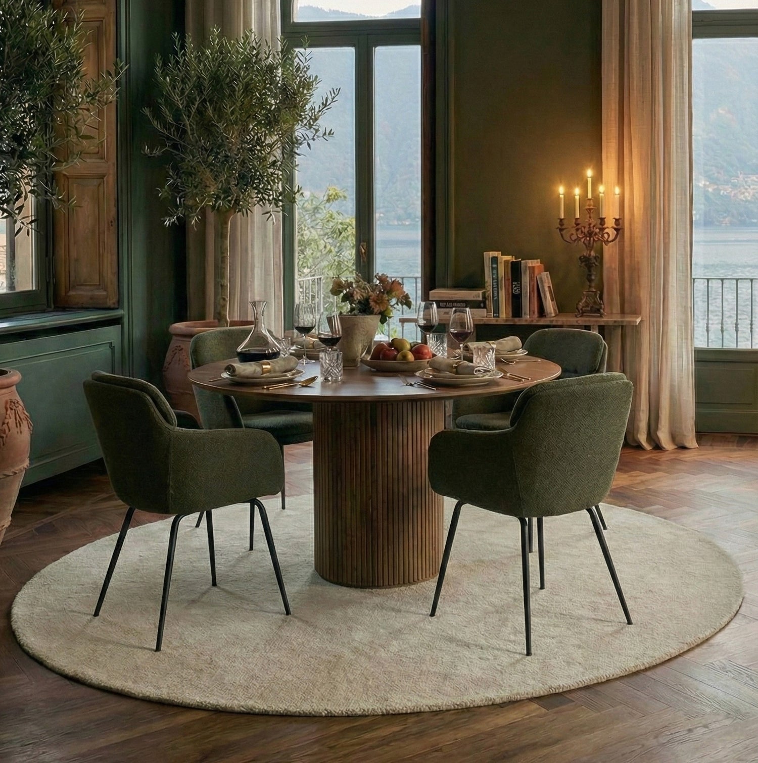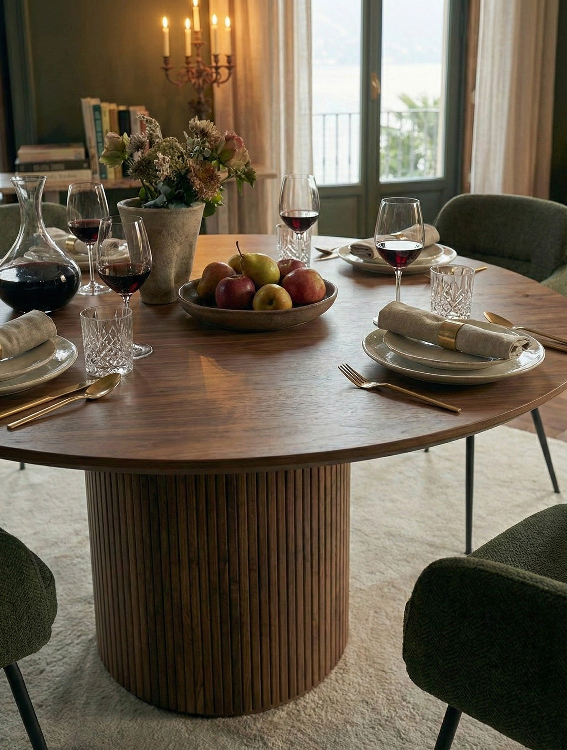 Runt matbord med mjukt rundad bordsskiva och cylindrisk pelarfot med räfflad struktur. Den varma, rökta ektonen ger djup och ro i rummet. Synliga ytor i ek är ekfaner i rökt utförande som ger en jämn, slitstark yta med äkta träkänsla och mindre underhåll än massiv ek. Perfekt för middagar där alla vill ha bra kontakt runt bordet.