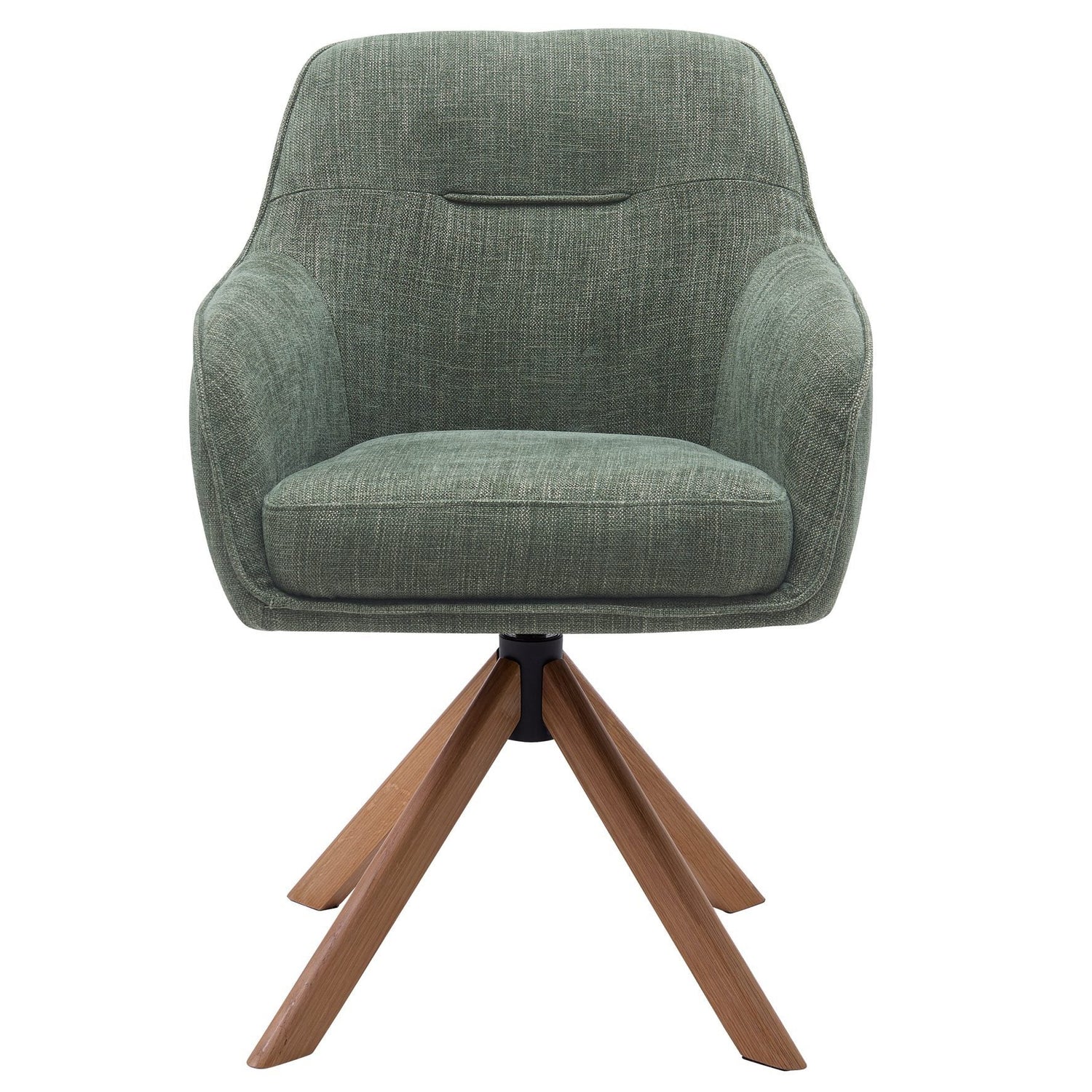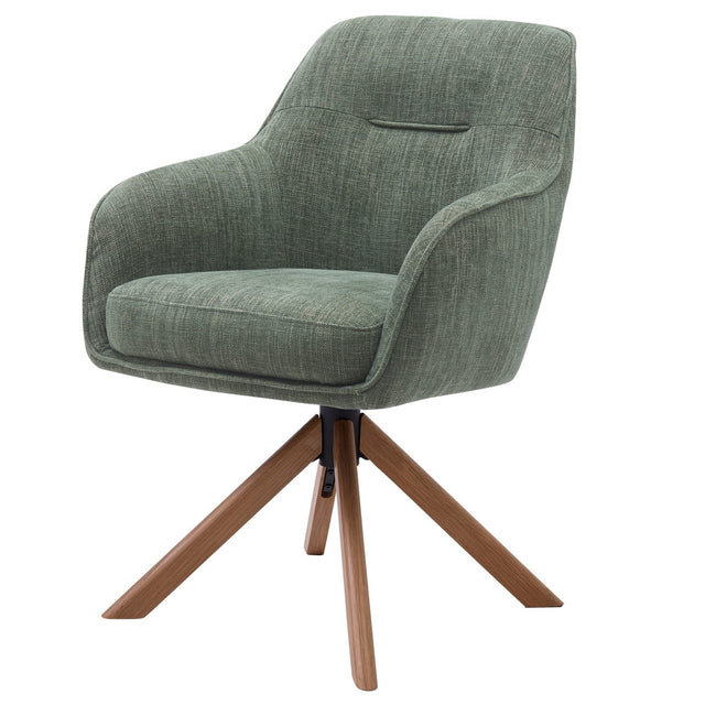 Kate i skogsgrön TOP-chenille för in naturens lugn. Den multicolor-effekten och den invävda, ”crisp and simple” strukturen ger en naturlig, lågmäld textur som passar många stilar, medan soft-touch-ytan gör stolen behaglig länge. Snurr och massiv ek ger både funktion och form. Tyget uppfyller OEKO-TEX®, vilket betyder att det är testat och innehåller inga skadliga ämnen.