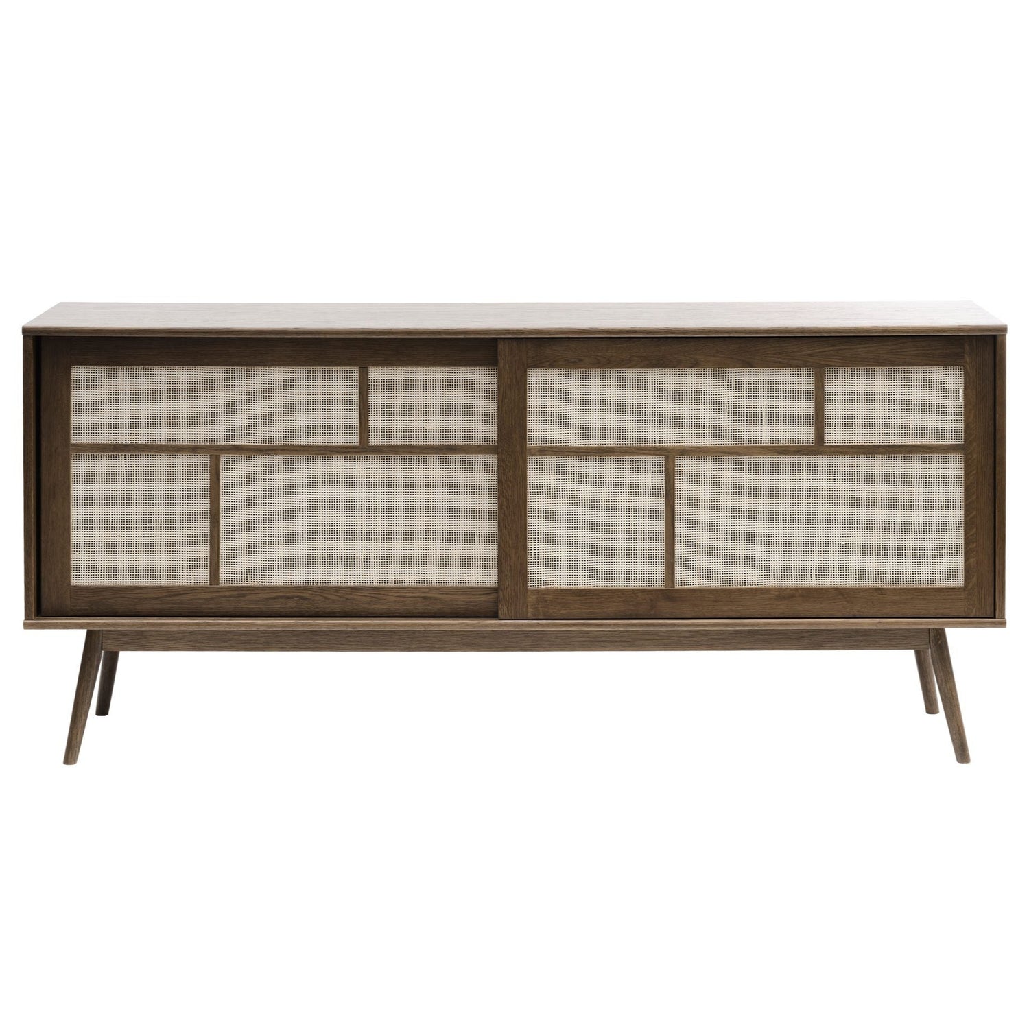 Raquel sideboard i rökt ekfaner kombinerar varm, mörk träton med funktionell förvaring i en tydligt skandinavisk form. De skjutbara dörrarna har en rottinginspirerad front som ger textur och mjukhet, samtidigt som de döljer allt du inte vill ha framme, porslin, glas, spelkonsoler, dukar eller småprylar. Den generösa längden på 180 cm gör möbeln till ett naturligt nav i matsalen eller vardagsrummet, och de avsmalnande benen ger ett lätt, nästan svävande uttryck. Finns även i ljus ekfaner.