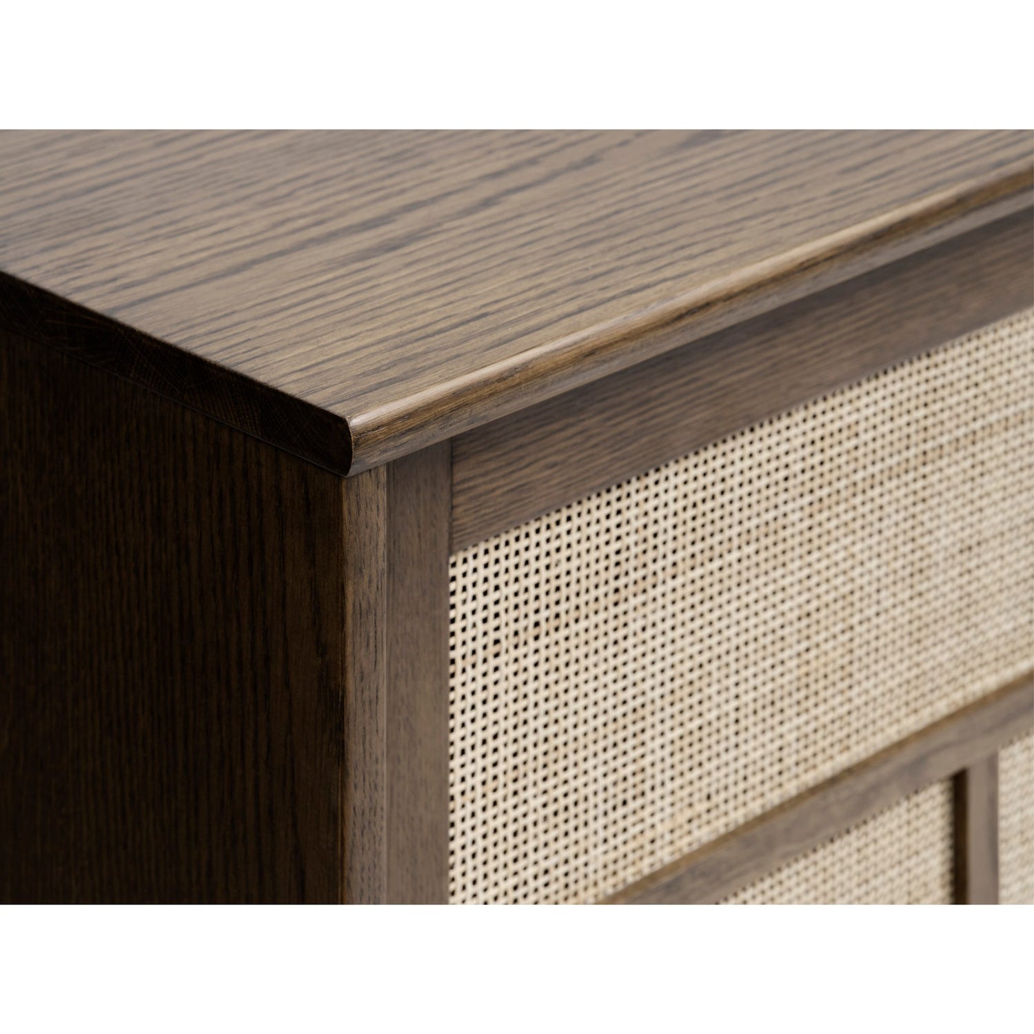 - Skjutdörrar med rottinginspirerad front som kombinerar struktur och dold förvaring