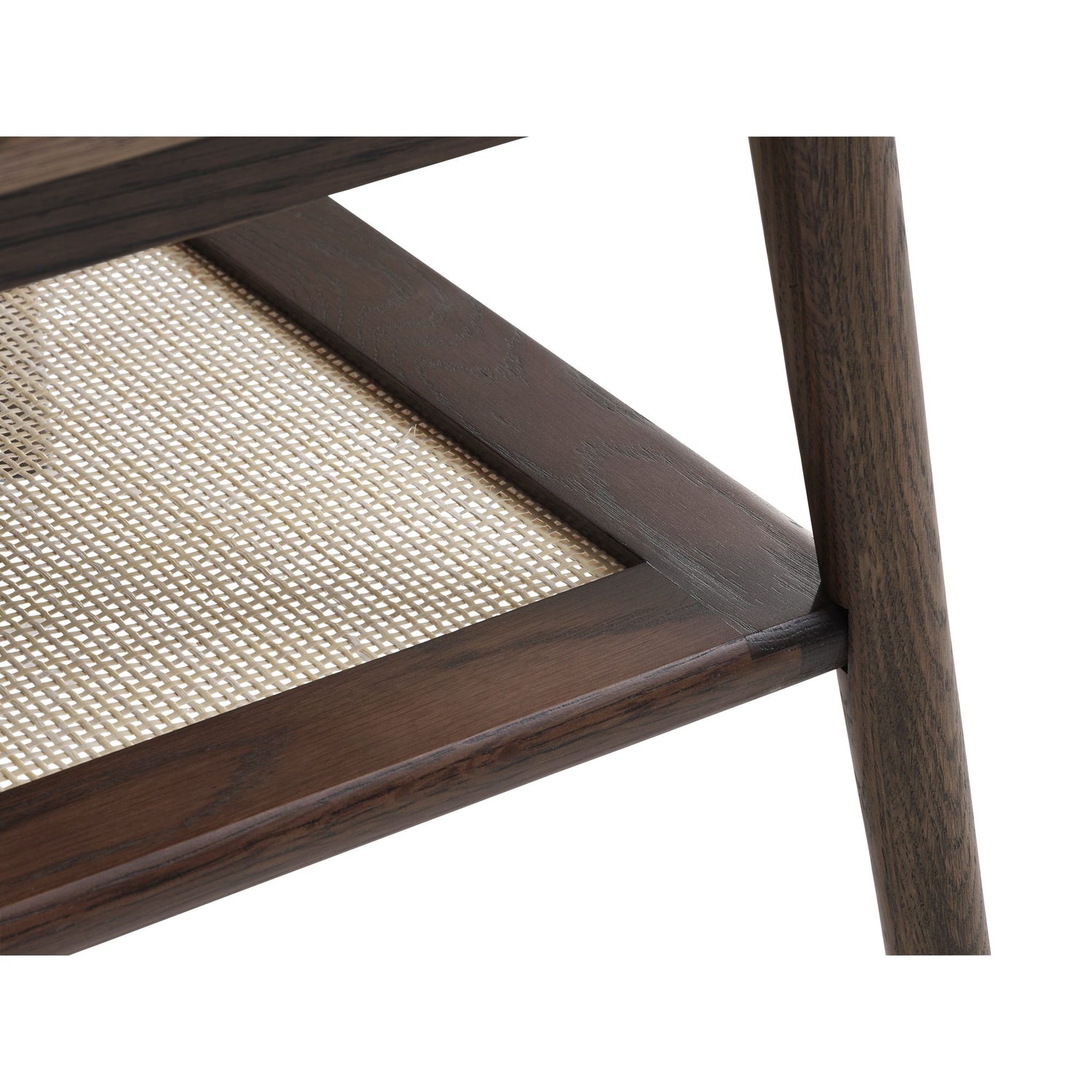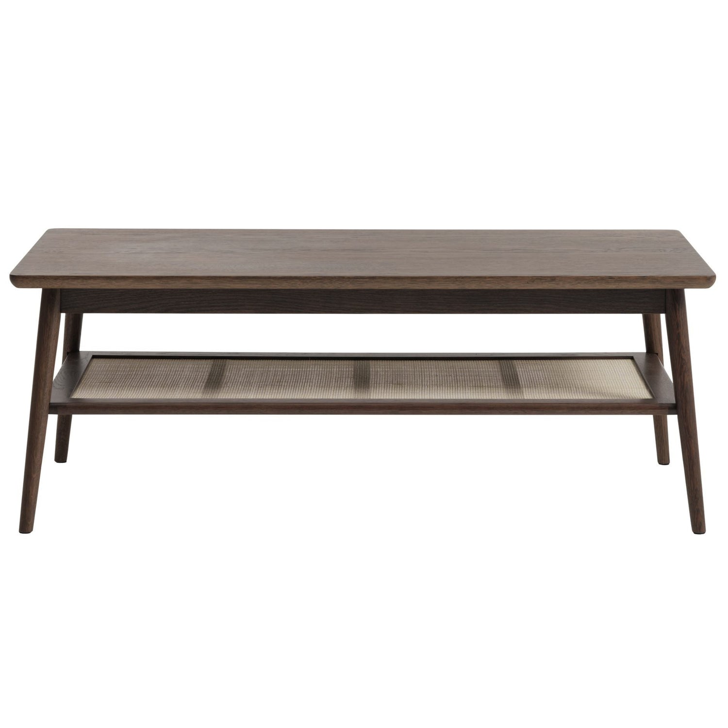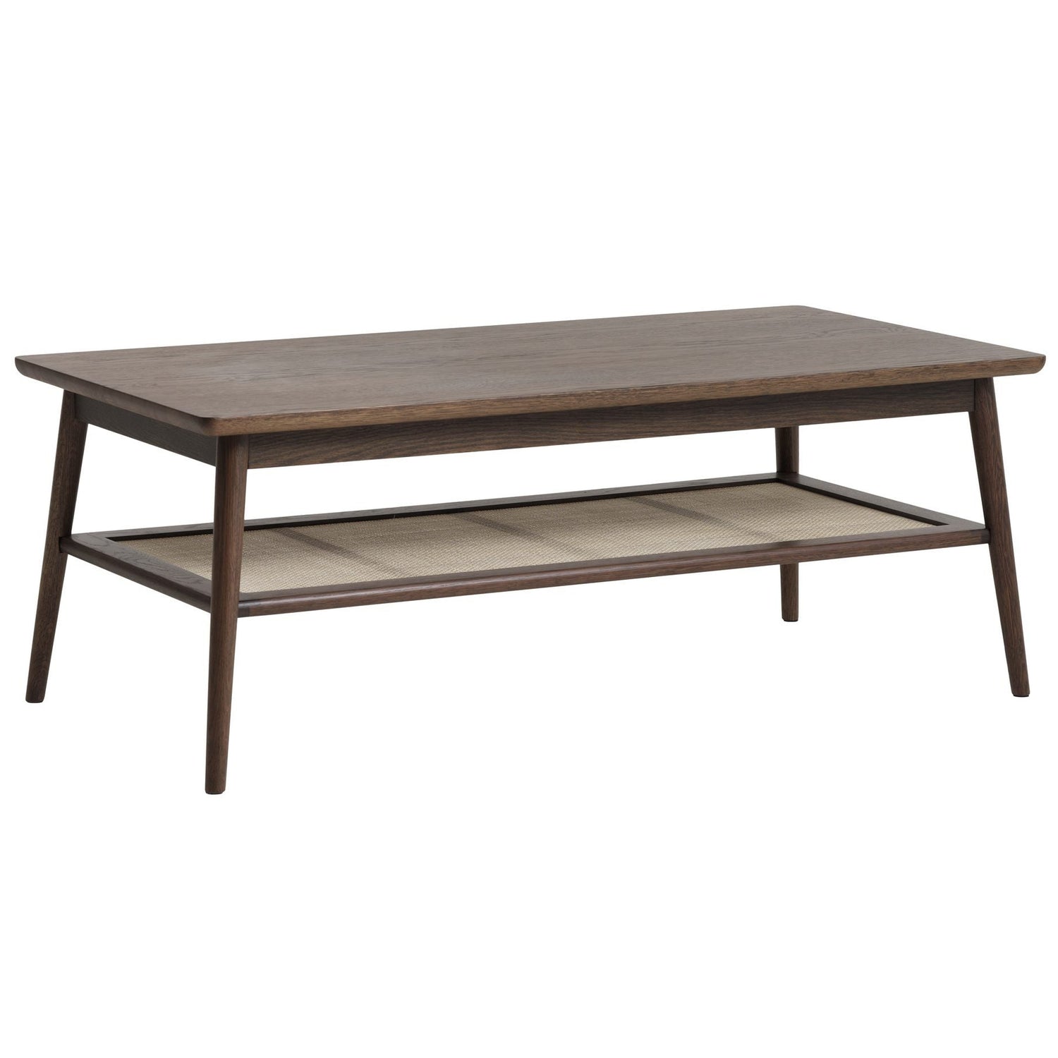 Raquel soffbord i rökt ekfaner kombinerar varm ton, praktisk funktion och skandinavisk enkelhet. Den mjukt avrundade bordsskivan ger gott om plats för vardagens brickor, kaffekoppar och böcker, medan hyllplanet under, med sin vävda detalj, rymmer allt du vill ha nära men inte på bordet. De avsmalnande benen och den mörkare trätonen ger ett ombonat uttryck som passar lika bra i moderna som i klassiska vardagsrum.