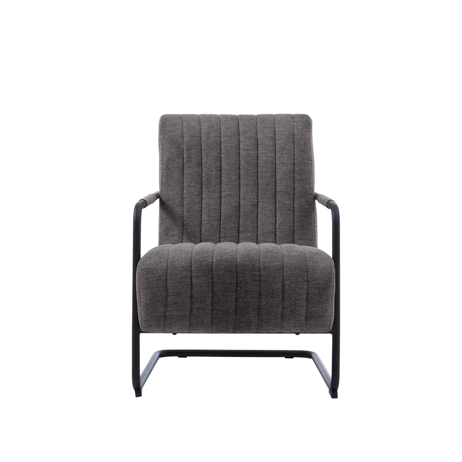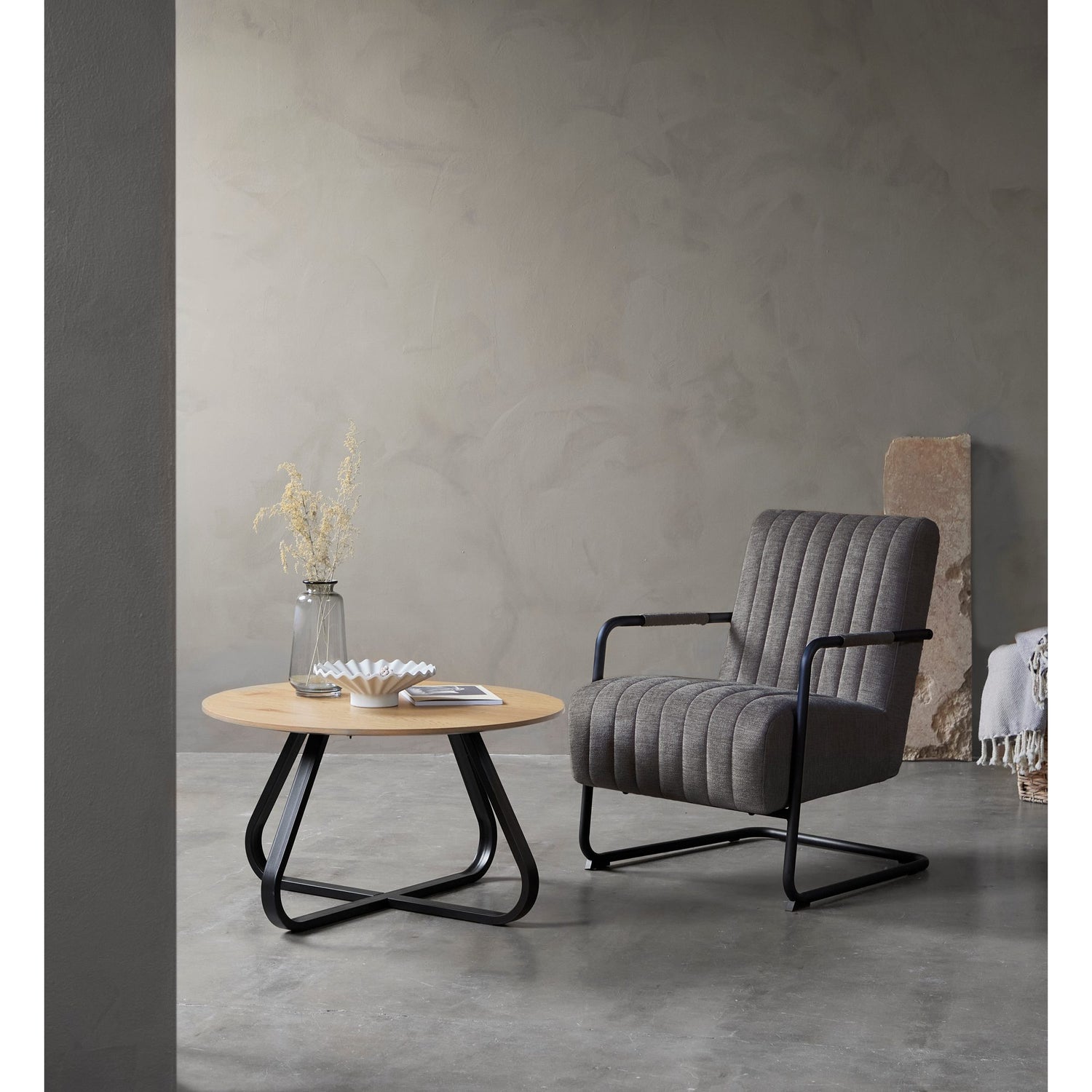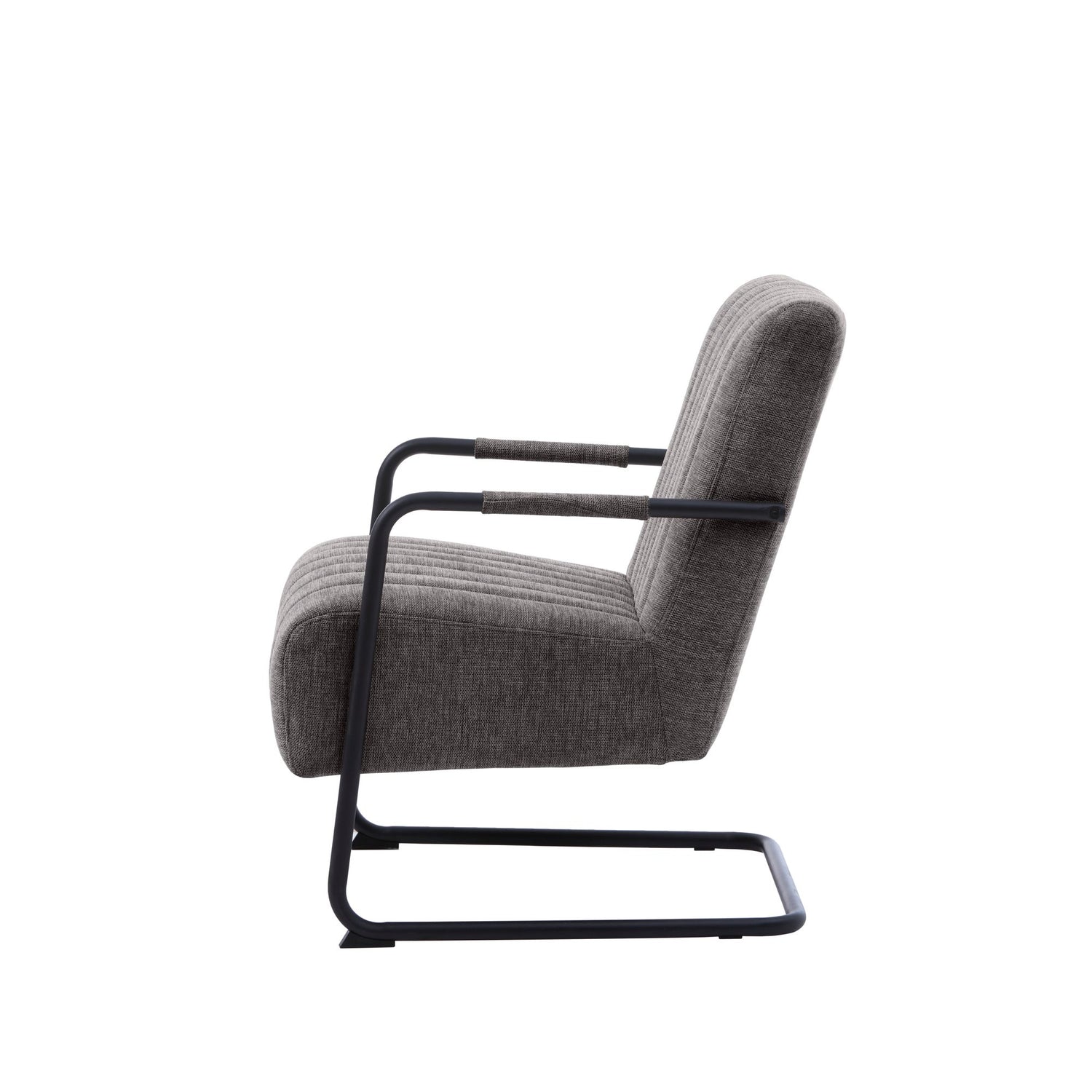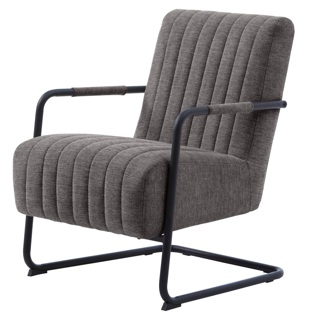 Colline är en modern loungefåtölj med tydlig retrokänsla. Den generöst stoppade sitsen och den stödjande ryggen har dekorativ kanalsömnad. Det svarta, pulverlackerade metallunderredet med armstöd i textil ger stabilitet, bra grepp och en skön lätt svikt – perfekt för läsning och avkoppling i vardagsrum eller sovrum.
