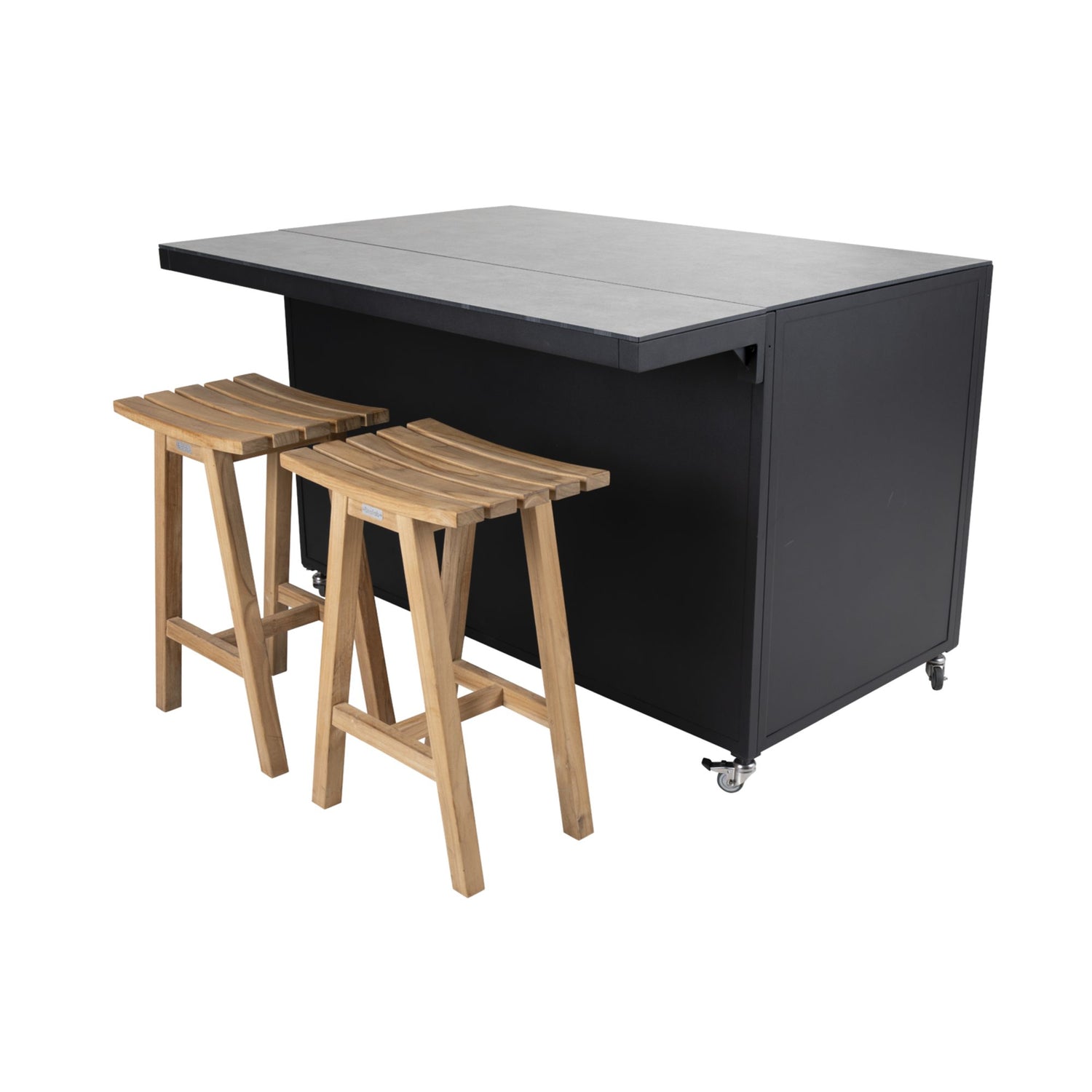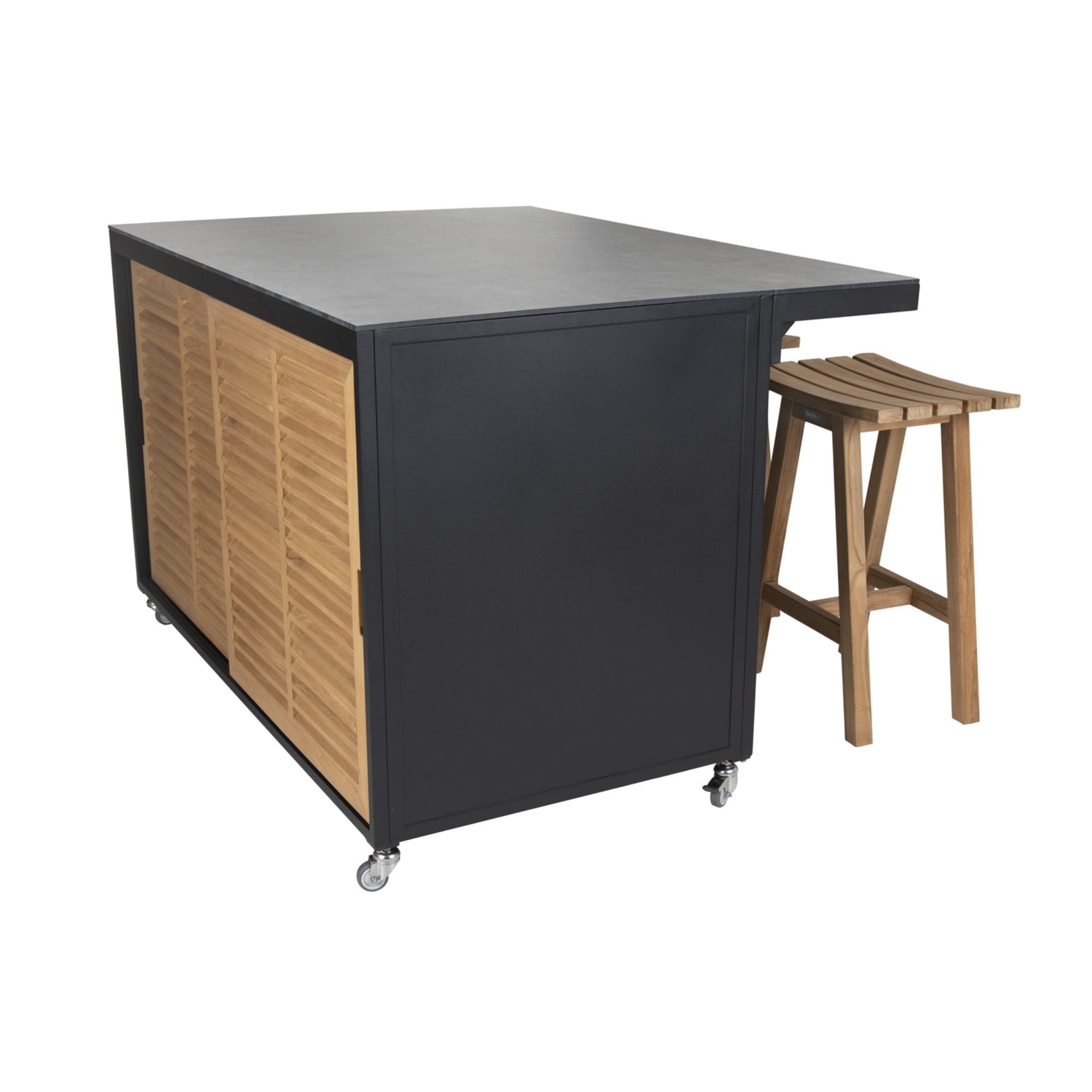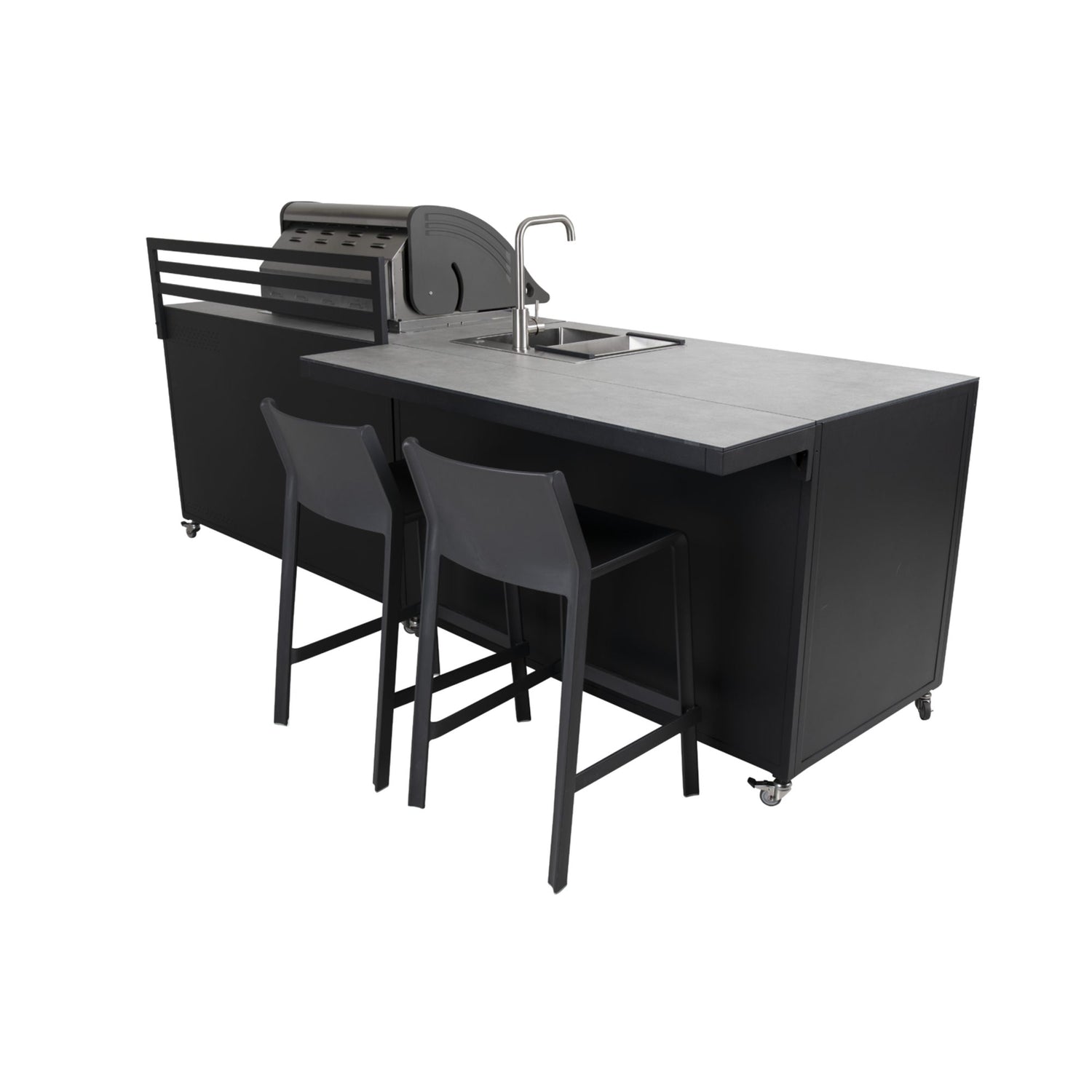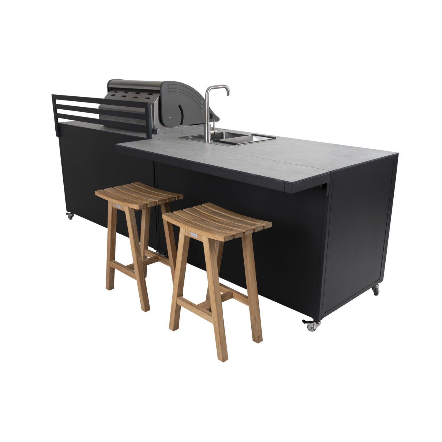 Ett premium utekök i svart aluminium med luckor i teak och topp i högtryckslaminat. Designad för ett modernt boende och med många smarta funktioner. Fornax består av 5 olika enheter som kan sättas ihop på olika sätt till ett komplett och stort utekök. En enhet är förberedd för att lägga till en gasolgrill (OBS! köps separat), en enhet har diskho och vattenkran och en enhet har en slät topp, perfekt som arbetsyta. Alla enheter har rejäla hjul, bakdel/staket och hylla. Som tillbehör finns också en skiva (stor och liten) som kan monteras på till en bardisk. Delen som är förberedd för en gasolgrill har mått för att passa t.ex. Napoleon BILEX485-1, och gasolgrillen köps separat. Bilderna med grillen monterad är enbart för visningssyfte.