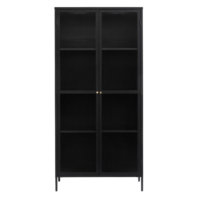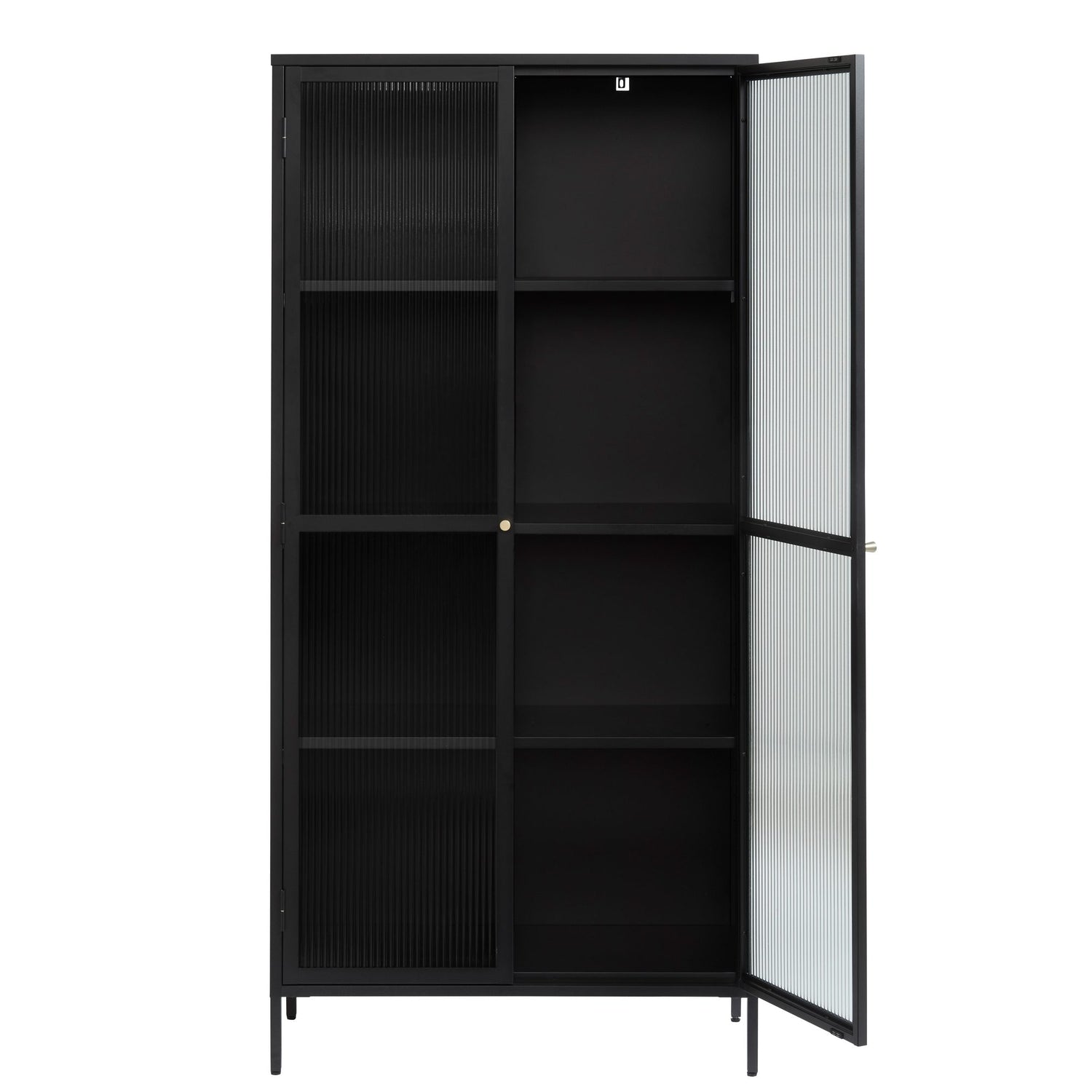 Riviera är ett högt och rymligt vitrinskåp i svart pulverlackerad metall. De två dörrarna i räfflat, tonat glas ger ett sobert och modernt uttryck och låter dig visa upp dina favoritsaker utan att allt känns helt öppet. Invändigt finns flera hyllplan som rymmer porslin, glas, böcker eller dekorationer,  perfekt både i vardagsrum och matsal. Den smala metallramen, de nätta benen och de små mässingsfärgade knopparna gör möbeln lätt i känslan trots sin storlek. Finns även i blå och grön.