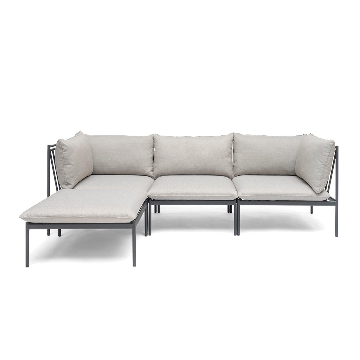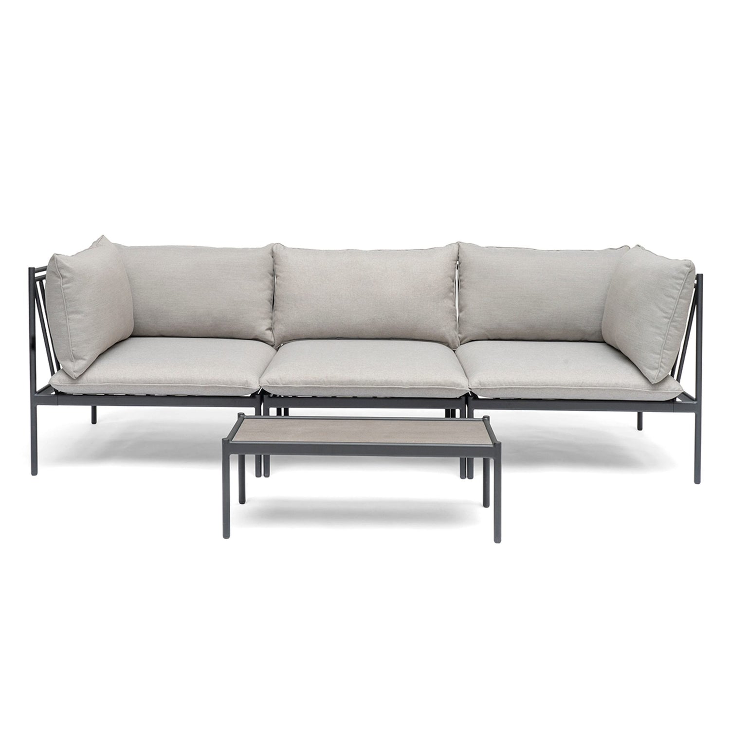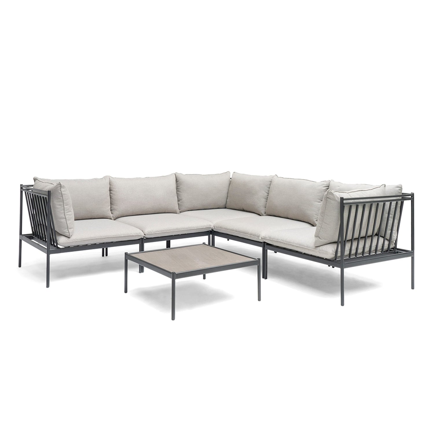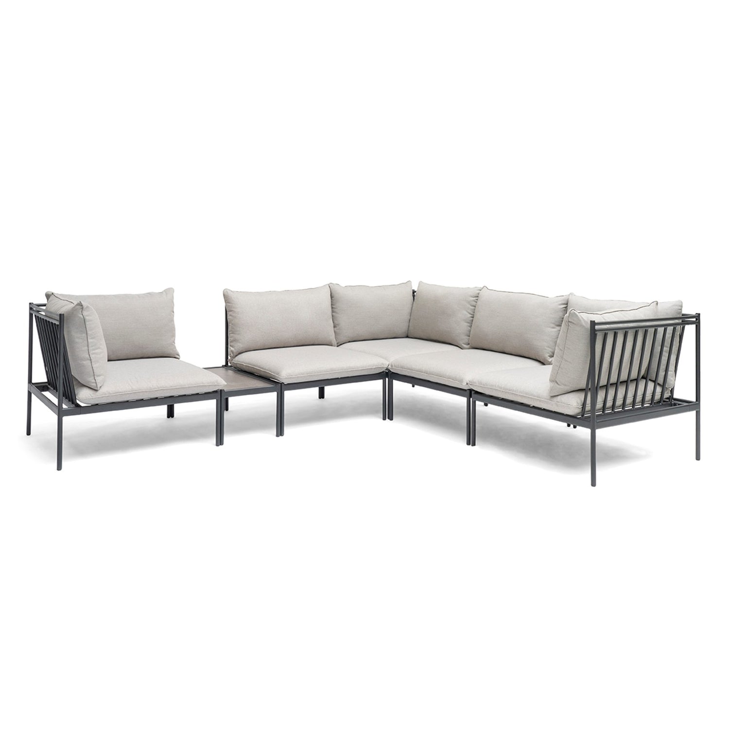 Modern stilren underhållsfri modulsoffa. Mjuka runda profiler möter stram design med lekfull modularitet. Kombineras precis så som du önskar med hörndelar, mittdelar, divaner och bord. Tillverkad i aluminium med dynor i gråbeige olefin. Avtagbar klädsel som kan tvättas i handtvätt 30 grader. Diskreta beslag och sammansättningar. Klämma medföljer för låsning av moduler.