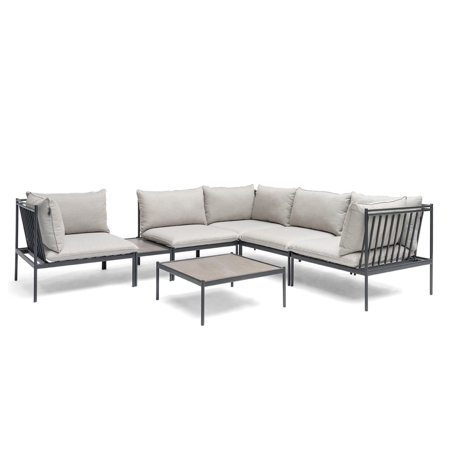 Modern stilren underhållsfri modulsoffa i mjuka runda profiler som möter stram design med lekfull modularitet. Kombineras efter ditt utrymme, precis så som du önskar. Tillgänglig i hörndelar, mittdelar, divaner och bord. Tillverkad i aluminium med dynor i gråbeige olefin. Avtagbar klädsel som kan tvättas i handtvätt 30 grader. Klämma medföljer för låsning av moduler.