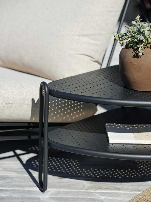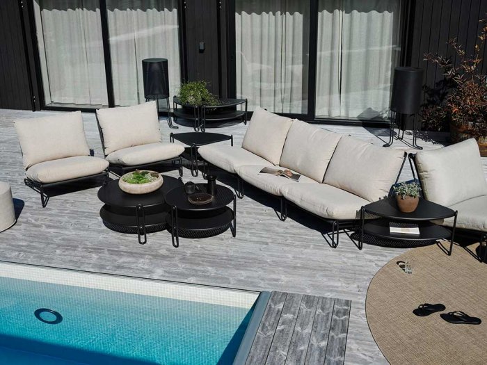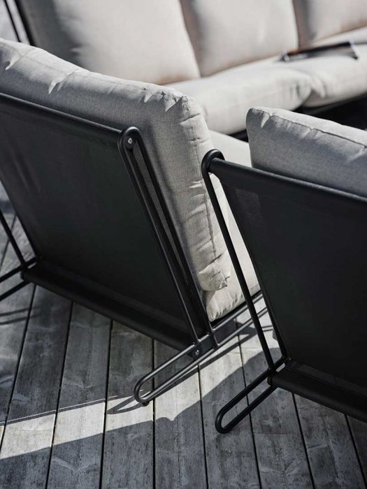 Blixt drar blickarna till sig, antingen som solitära fåtöljer eller som sammansatt soffa. Moderna vinklar och god komfort - passar in i flera olika utemiljöer. Stomme i aluminium (Light Grey och Svart) och vattentåliga dynor i olefintyg med TPU-liner. Dynorna finns i grön (Teddy Verde), grå (Sky Grey) och beige (Clay beige). För att koppla ihop till en soffa, finns det beslag (medföljer) som tillbehör.