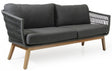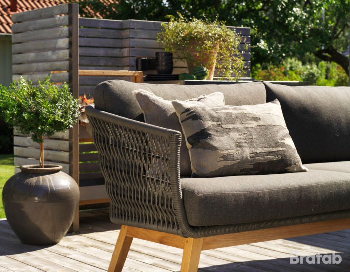 Kenton är en modern och elegant 3-sits soffa från Brafab. Kenton har ett elegant underrede i massiv teak som gör att soffan både ser nätt och stilren ur. Sitsen är vävd i tjock rund 6,5mm grå konstrotting med en utmärkt kvalitet och finish. Dynorna är sedan klädda med ett mycket slitstarkt olefintyg som klarar av vatten på ett utmärkt sätt. Soffan bör dock skyddas från regn samt skyddas helt under höst/vinter.