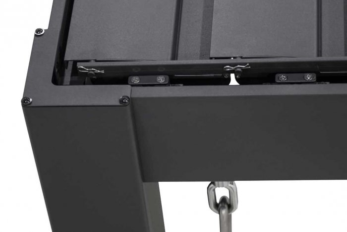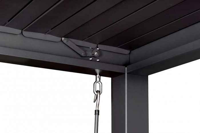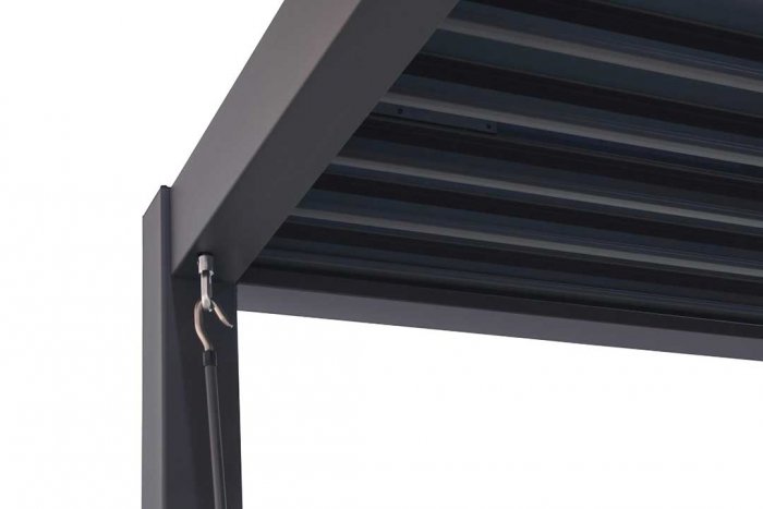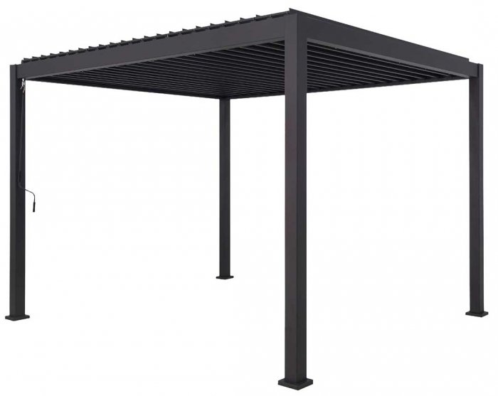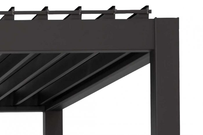 Utsikt är en premium pergola utan dess like i en robust konstruktion helt i matt pulverlackad svart aluminium. Lamelltak som går att öppna och stänga beroende på hur mycket skydd som önskas. Det finns även dränering i stolparna. Sidogardin säljes separat.