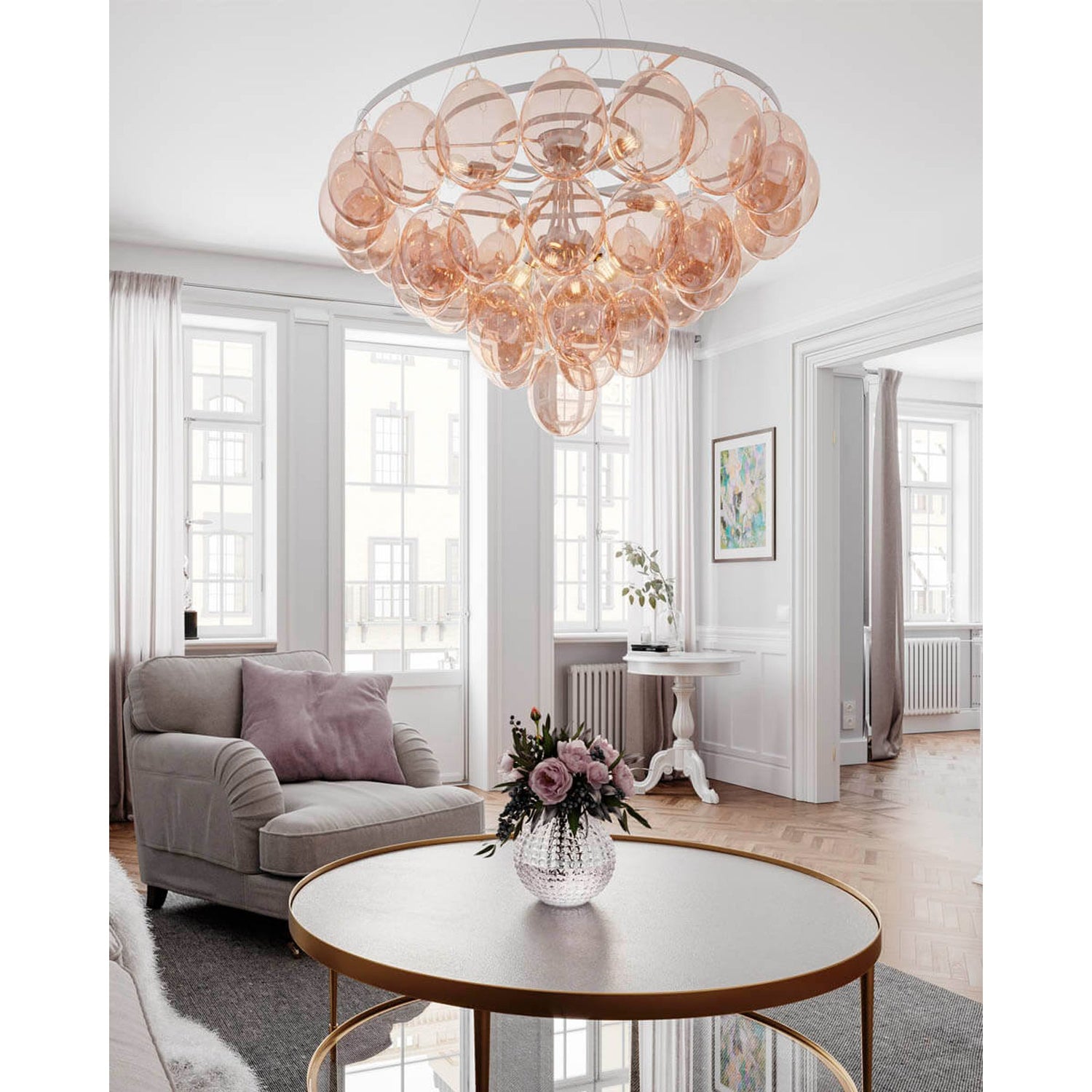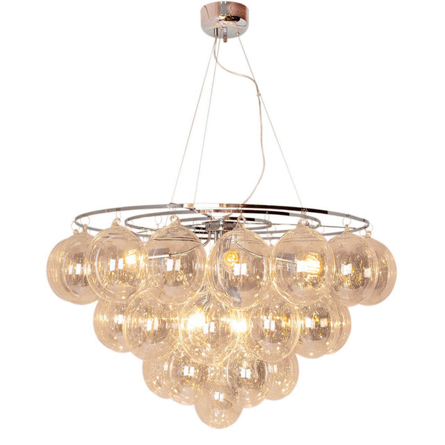 Det senaste tillskott i vår populära Gross serie. Gross Giant är en fantastisk, exklusiv taklampa bestående av 36 skira glaskulor. Glaskulorna är 15 cm i diameter och 18 cm långa och fästs på metallcirklar i olika nivåer och bildar tillsammans en modern takkrona. Taklampan är 1 m i diameter och 60 cm hög. Denna stora, magnifika taklampa passar väl i stora miljöer.