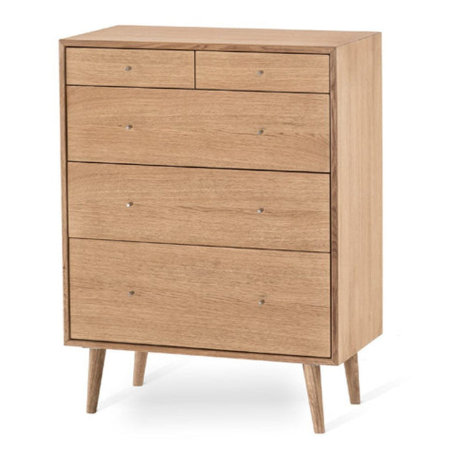 Scandi byrå i fanerad oljad ek. Scandi byråer är en uppskattad serie i skandinavisk design. Massiva svarvade utställda träben. Samtliga lådor är självstängande och snyggt inramade av byråns yttersidor, toppskiva och bottenplatta. Stålknoppen är diskret och nätt. I serien finns även två andra byråer. Byrån finns även i vitoljad ekfanér och heter då Nordik. Båda serierna tillverkas i Europa.