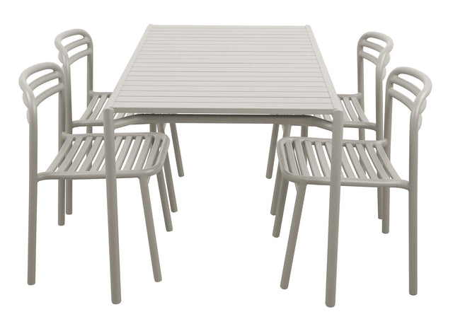 Bliss matbord med fyra stolar kombinerar en modern och urban stil med en inbjudande, bekväm känsla. Perfekt för utomhusbruk på terrasser, stora balkonger, trädgårdar eller restauranger, denna matgrupp bjuder in till långa måltider och trevliga sammankomster.