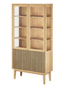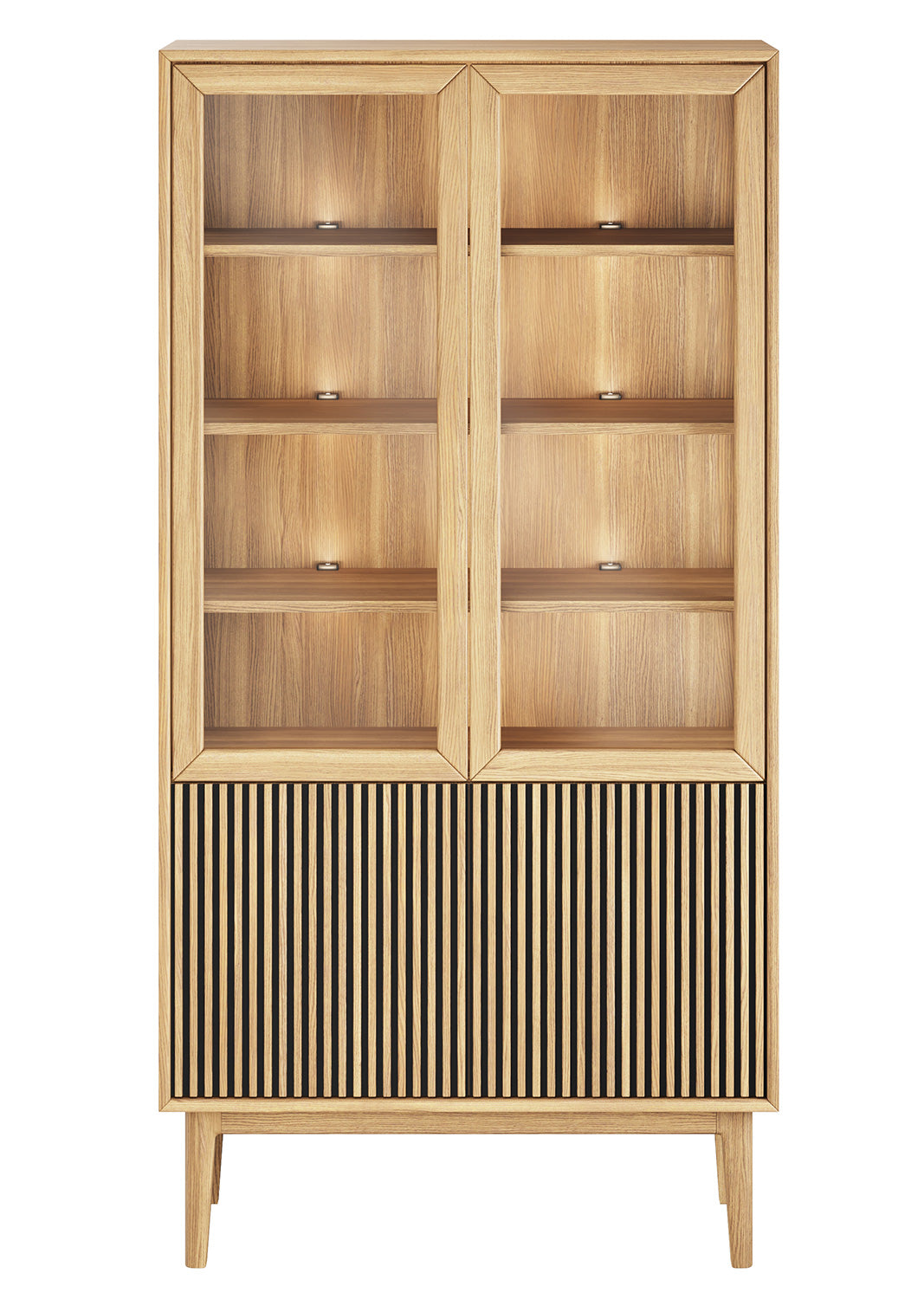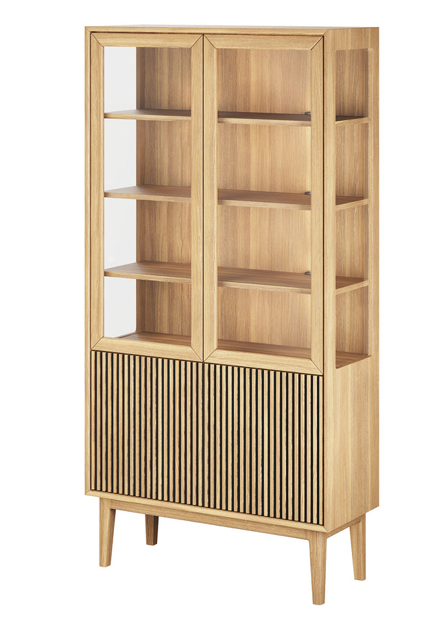 Invändigt är skåpet utrustat med fyra genomgående hyllplan i fanerad ek, alla justerbara för att enkelt anpassas efter dina behov. Samtliga synliga hyllor är dessutom förberedda för belysning, så att du smidigt kan komplettera vitrinen med ljus och lyfta fram dina föremål på ett stämningsfullt sätt (köps separat).