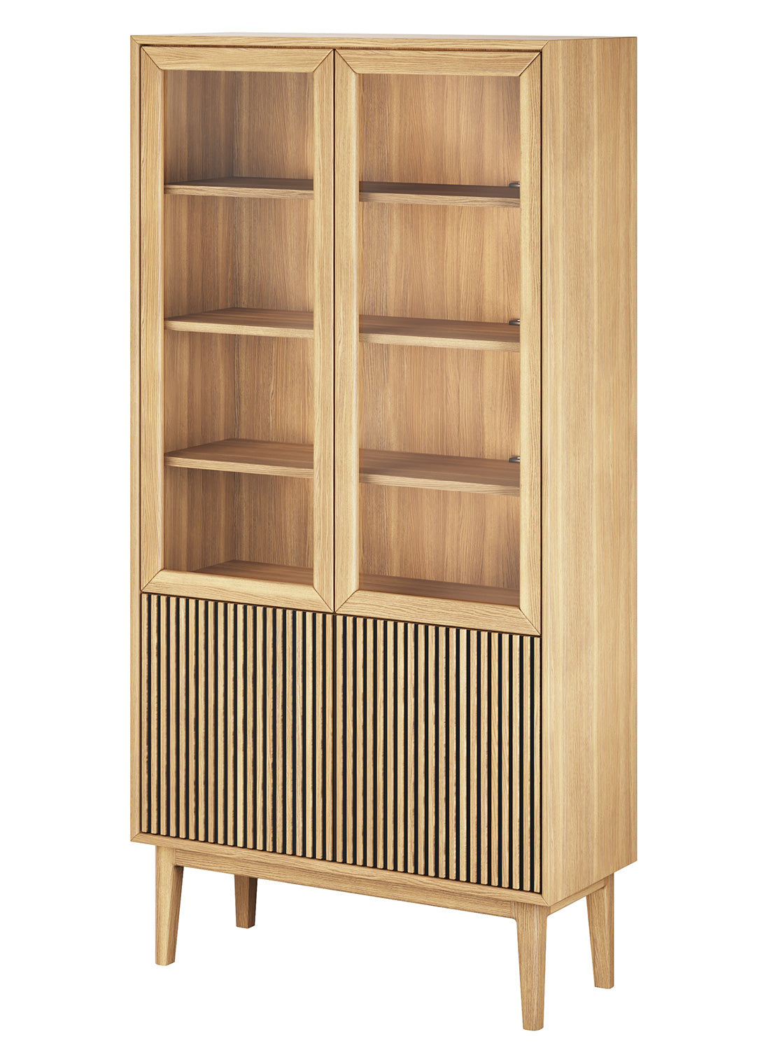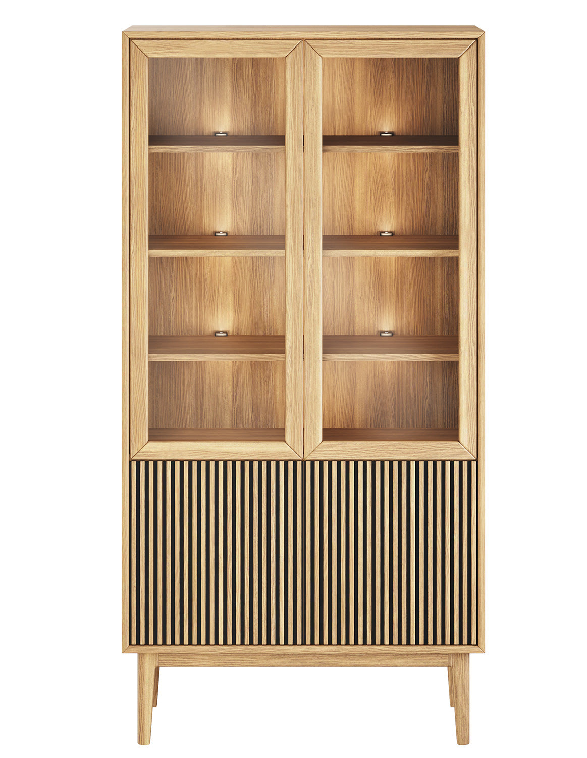 Invändigt är skåpet utrustat med fyra genomgående hyllplan i fanerad ek, alla justerbara för att enkelt anpassas efter dina behov. Samtliga synliga hyllor är dessutom förberedda för belysning, så att du smidigt kan komplettera vitrinen med ljus och lyfta fram dina föremål på ett stämningsfullt sätt (köps separat).