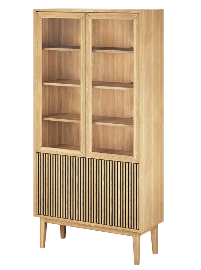 De karakteristiska lamelldörrarna i ekfaner på svart MDF ger vitrinskåpet ett modernt och stilfullt utseende, samtidigt som de skapar en elegant kontrast mot den massiva ekens naturliga struktur.