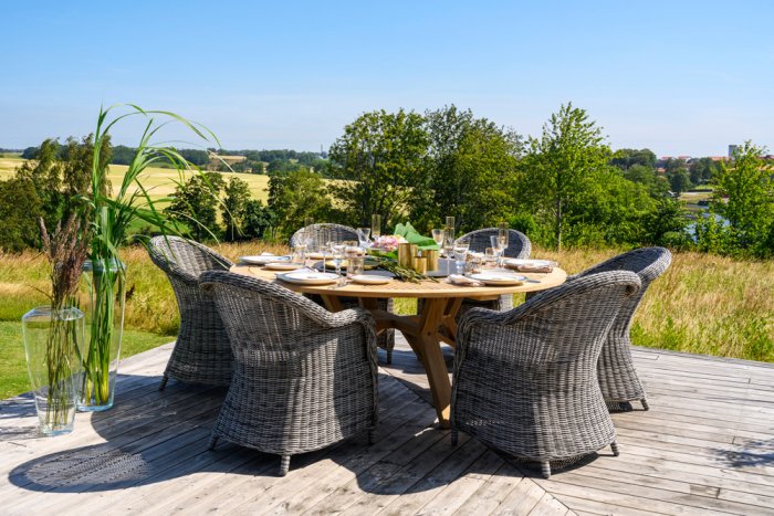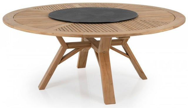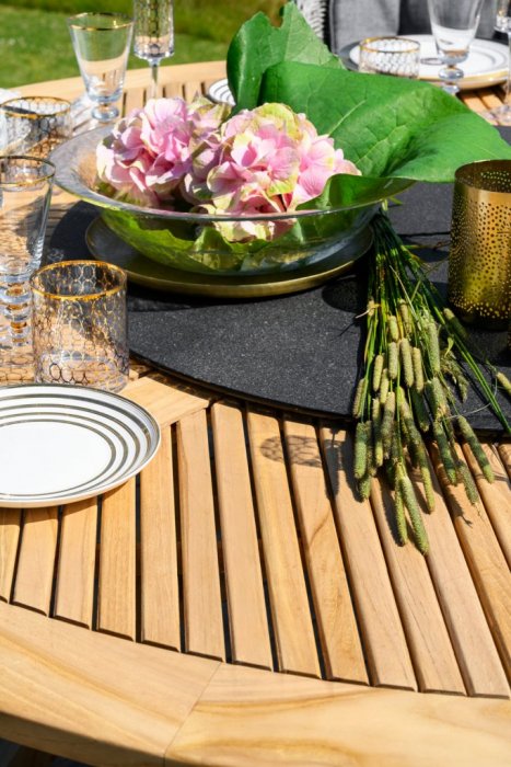 Circus är ett modernt och vackert runt matbord i naturoljad teak. Toppskivan har eleganta teakribbor som ger ett härligt mönster och liv till bordet. Underredet har en snygg och rejäl design samtidigt som den lämnar mycket utrymme för ben. I mitten finns en snurrskiva i tempererat glas med spraystone på toppen. Det är en öppning i bordet under snurrskivan.